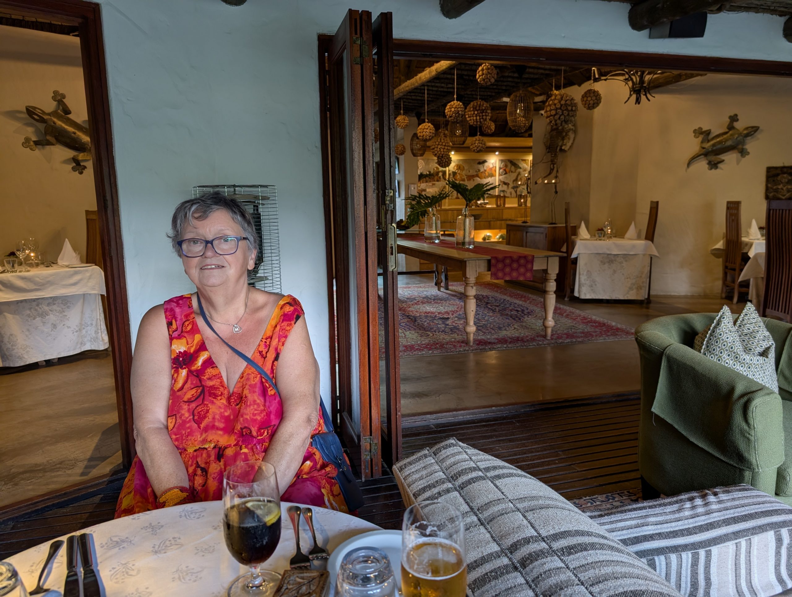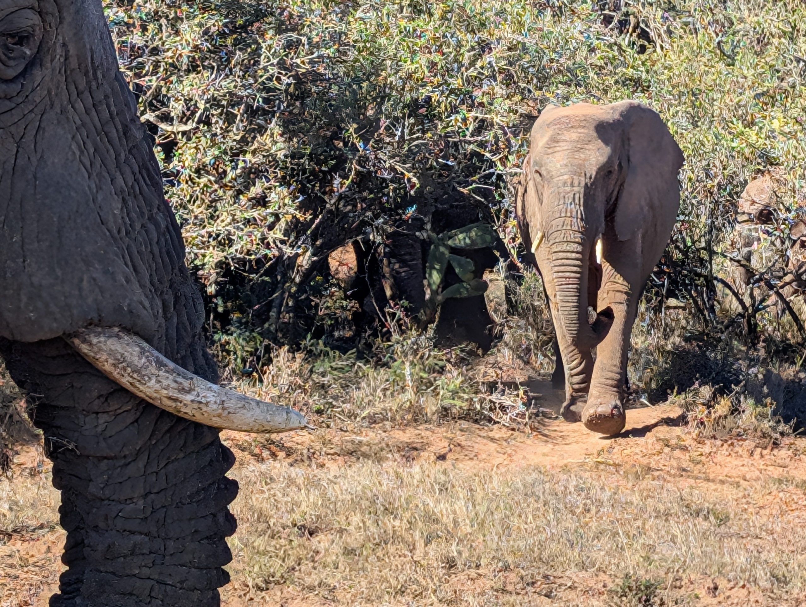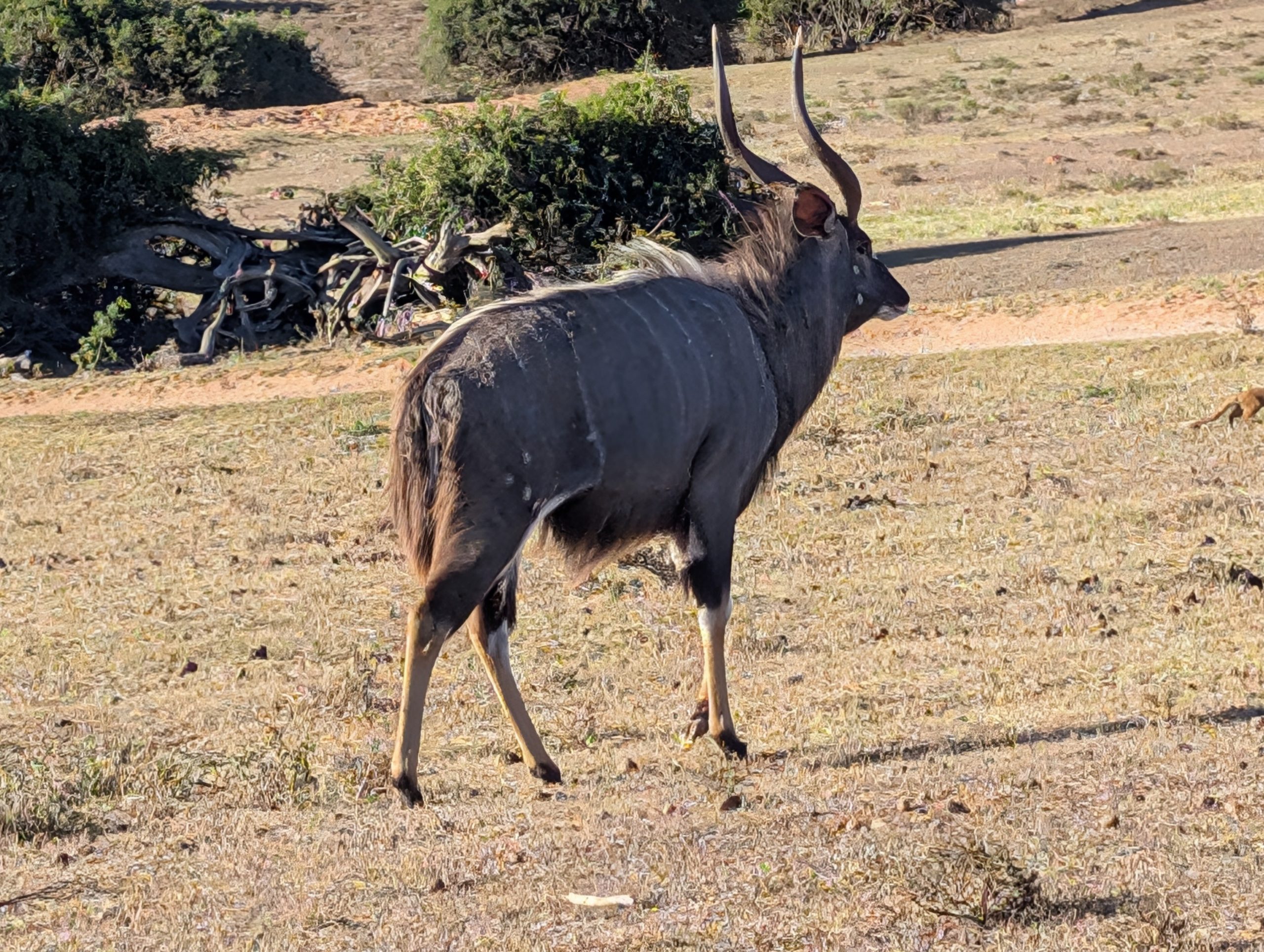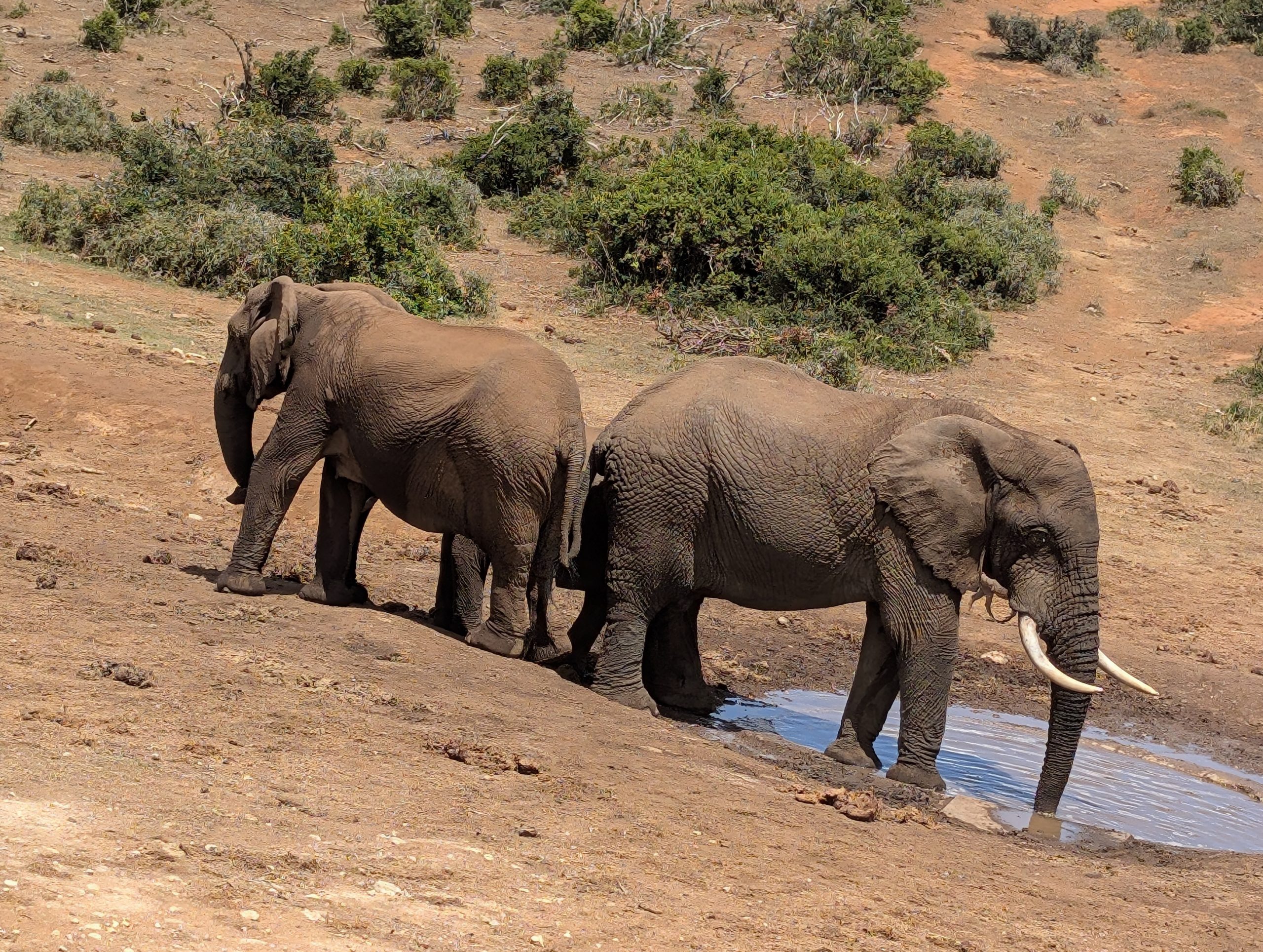 Die Anfahrt vom Tsitsikamma NP hierher zum Addo NP war mit knapp 4 Stunden ziemlich weit. Von Melanie bekamen wir die Info, uns nicht auf Google Maps zu verlassen, sondern aus Sicherheitsgründen die N2 nach Port Elizabeth zu nehmen. Hier kommt man mit dem Flugzeug an, wenn man Südafrika in einer Reise das alles vereint. Die N2, die weiter nach Durban geht, verlassen wir und fahren weiter auf der N 10 nach Paterson. Hier wird es Bevölkerungsärmer und viel Landwirtschaft. Am späten Nachmittag erreichen wir unsere Lodge. Die Zufahrt will Norbert nicht glauben, das ist bei uns eine Fahrt ins Maisfeld. Überall sind Haine mit Zitronen 🍋 und Limetten 🍋🟩. Die Lodge ist der Wahnsinn. Die Dame hat uns soviel gezeigt, der Spa Bereich, das Restaurant mit Fitnessraum, an der Rezeption ist ein Pool und dann kommt unser Zimmer. Ein großer Aufenthaltsraum, ein großes Schlafzimmer mit Moskitonetz, ein noch größeres Bad mit Riesendusche, Außendusche, eine schöne Terrasse mit Liegestühle und eigenen Pool. Das Abendessen ist der Wahnsinn, ein 3 Gänge Menü. Tomatensuppe, Lammkeule und Eis. Mir reißt es den Bauch fast ab, das bin ich nicht mehr gewöhnt. Am Tag 2 ist Treffen an der Rezeption. Dort kann man Kaffee trinken, Kekse essen oder Muffins. Pünktlich ½8 geht es los mit einem frisch gewaschenen Jeep. Auch die anderen Autos sind gewaschen worden. Unser Guide heißt Goldwin. Wir fahren zum Addo NP. Viele Tiere haben wir gesehen, von Buffalo, Antilope, Zebras, Schildkröte 🐢, Tausendfüßler, Bamboos (Paviane) Vögel und sehr viele Elefanten. Gegen 10 Uhr führen wir zum Picnic Areal. Dort gab es Kaffee, Saft, Joghurt, Müsli, Obst und Rührei eingepackt. Gegen Mittag waren wir wieder in der lodge. Dort wartete ein Hydro Aroma Therapie Bad auf uns. Da man nicht rechtzeitig beginnen könnte, gab es als Entschädigung 1 Flasche Champagner. Die Wanne war ein Whirlpool, überall Rosenblätter verstreut und Kerzenlicht. Total romantisch. Danach hatten wir Lunchtime, eine hübsch verpackte Semmel mit Salat. Abend gab es wieder das 3 Gänge Menü. Mir ist das eigentlich alles zuviel, aber will man das nicht, fasst es der Koch auf, als würde es nicht schmecken, aber das ist so was von lecker. Heute gibt es 🍄🟫 Suppe, Kingklipfish, sehr lecker und caramelisiertes Eis. Ich trinke einen Sauvignon Blanc aus Stellenbosch und Norbert einen Bacardi Rum.
