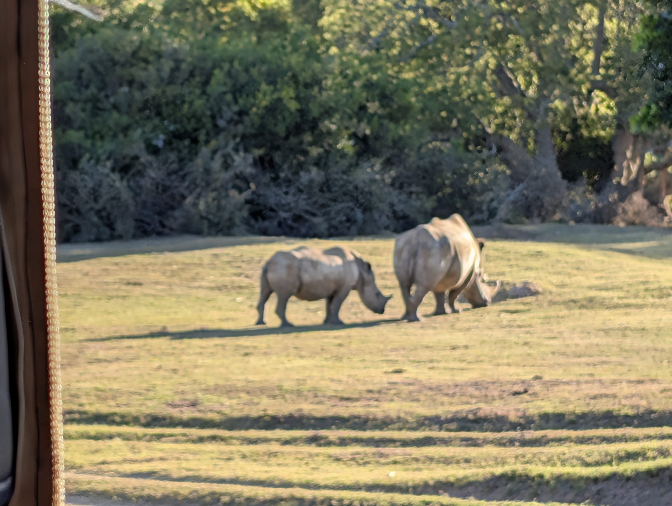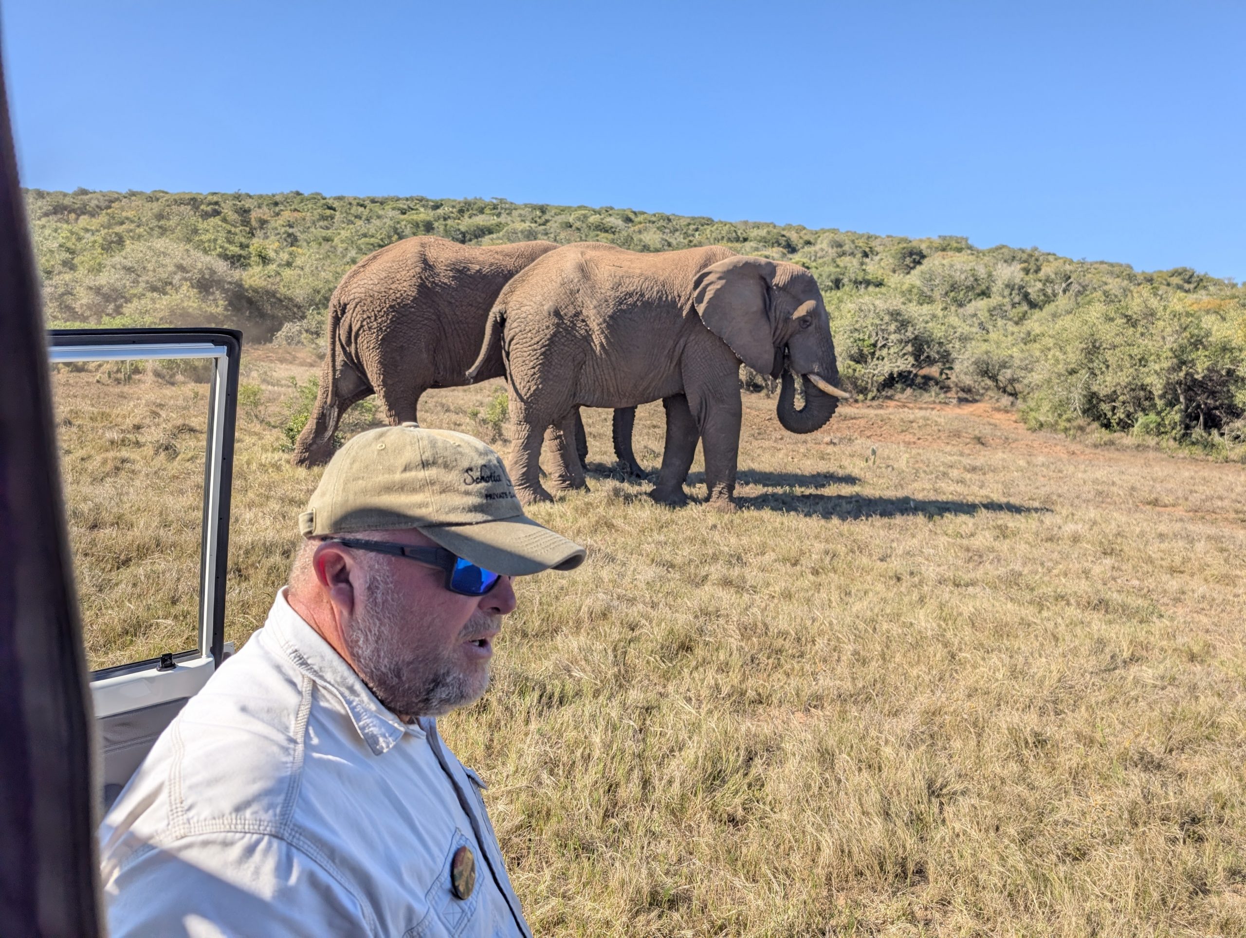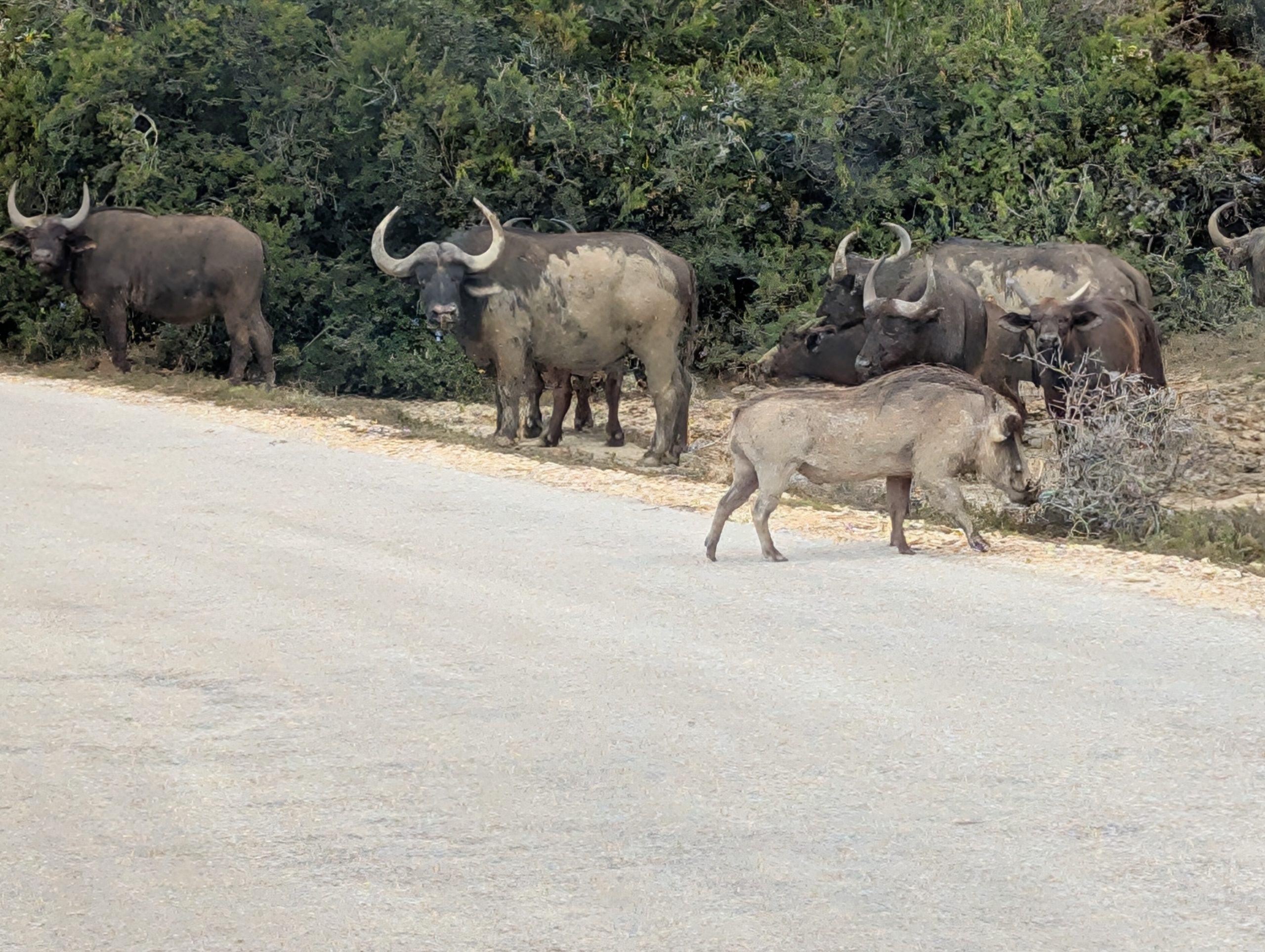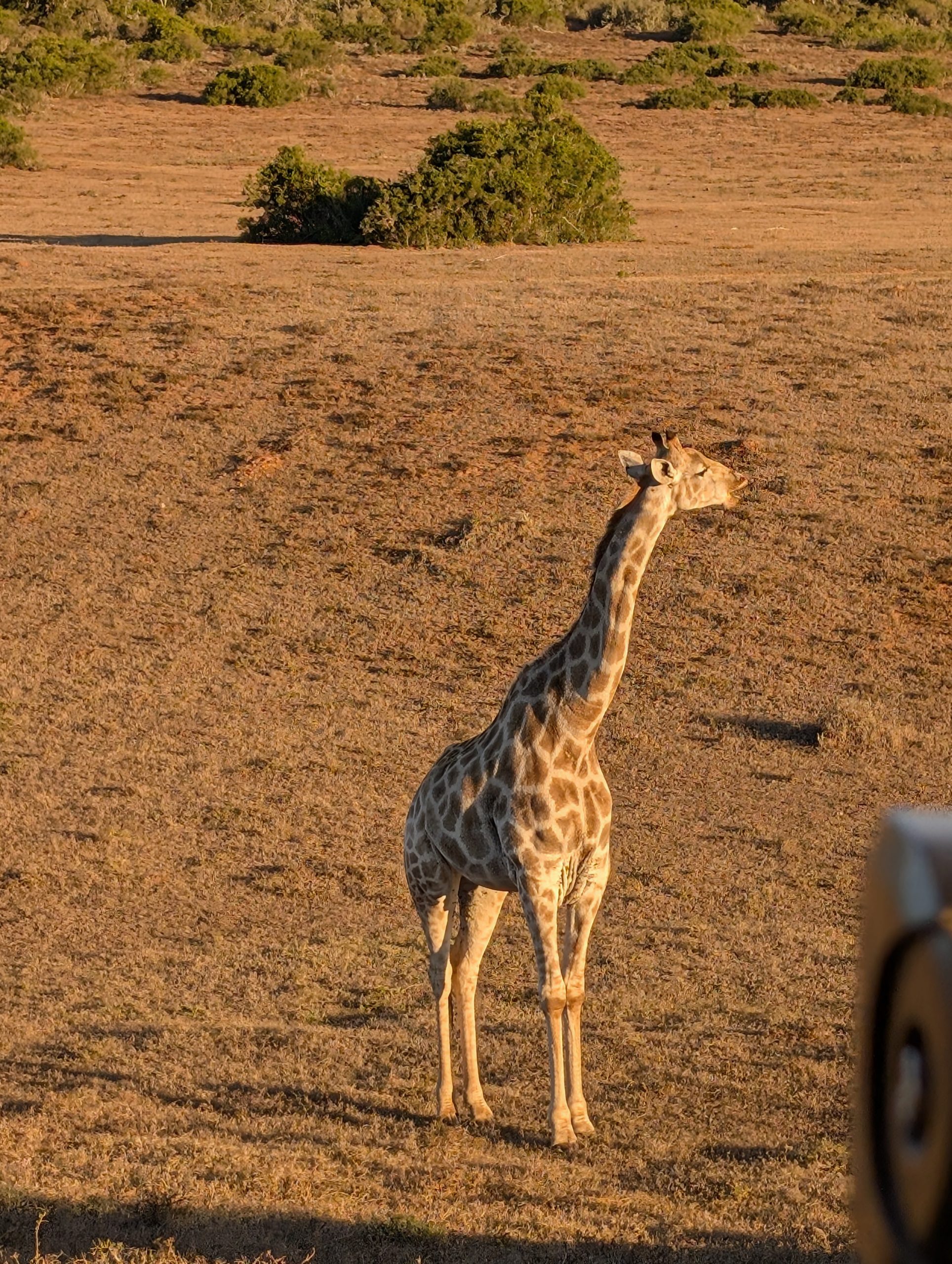 Am 3. Tag beginnen wir mit einer Rücken Schulter Massage und anschließend Breakfast. Nun haben wir bis 13.45 Uhr Zeit zum Relaxen, bis unser Fahrer kommt. Uns holt ein Fahrer von Uber ab. Der war gut drauf. Eine ¾ Stunde fahren wir zur Schootia Privat Game Reserve. Pünktlich um 15 Uhr beginnt die Safari mit Roger. 9 Personen sind wir. Wir haben ganz viele verschiedene Tiere gesehen. Man hatte den Eindruck, dass alle Tiere einen Namen haben. Das Areal gehört mit zum Addo NP, ist aber im Privatbesitz. Wir haben auch Löwen 🦁 gesehen, die waren aber faul und haben geschlafen. Die Sonne scheint ganz schön toll, wir haben 34⁰. Dann haben wir viele Antilopen, Buffalos gesehen. Einmal haben wir 2 ausgewachsene Elefanten gesehen. Wir wollten schon weiter fahren, auf einmal kamen kleine Elefanten mit ihren Mamas aus dem Gebüsch. Die großen Elefanten kreisen die kleinen ganz schön ein und beschützen ihre Babys. Doch von dem aller kleinsten ist mir ein hervorragender Schnappschuss gelungen. Dann haben wir ein Nashorn gesehen, welches eine 6 Monate alte Tochter hatte. Hippos waren im Wasser und ein Krokodil. Die Safari ging bis 20 Uhr. Nun sind wir zu einem großen Zelt. Dort brannte Lagerfeuer und es gab gegrilltes. Einer hat wunderschöne Tierbilder gemalt. Gegen 21 Uhr waren wir wieder am Basislager und dort standen auch schon die Driver, die uns zurück in die Hotels brachten. Unser Fahrer ist gefahren wie der Teufel und hat kein Wort gesprochen. Es war insgesamt ein sehr schöner Tag.