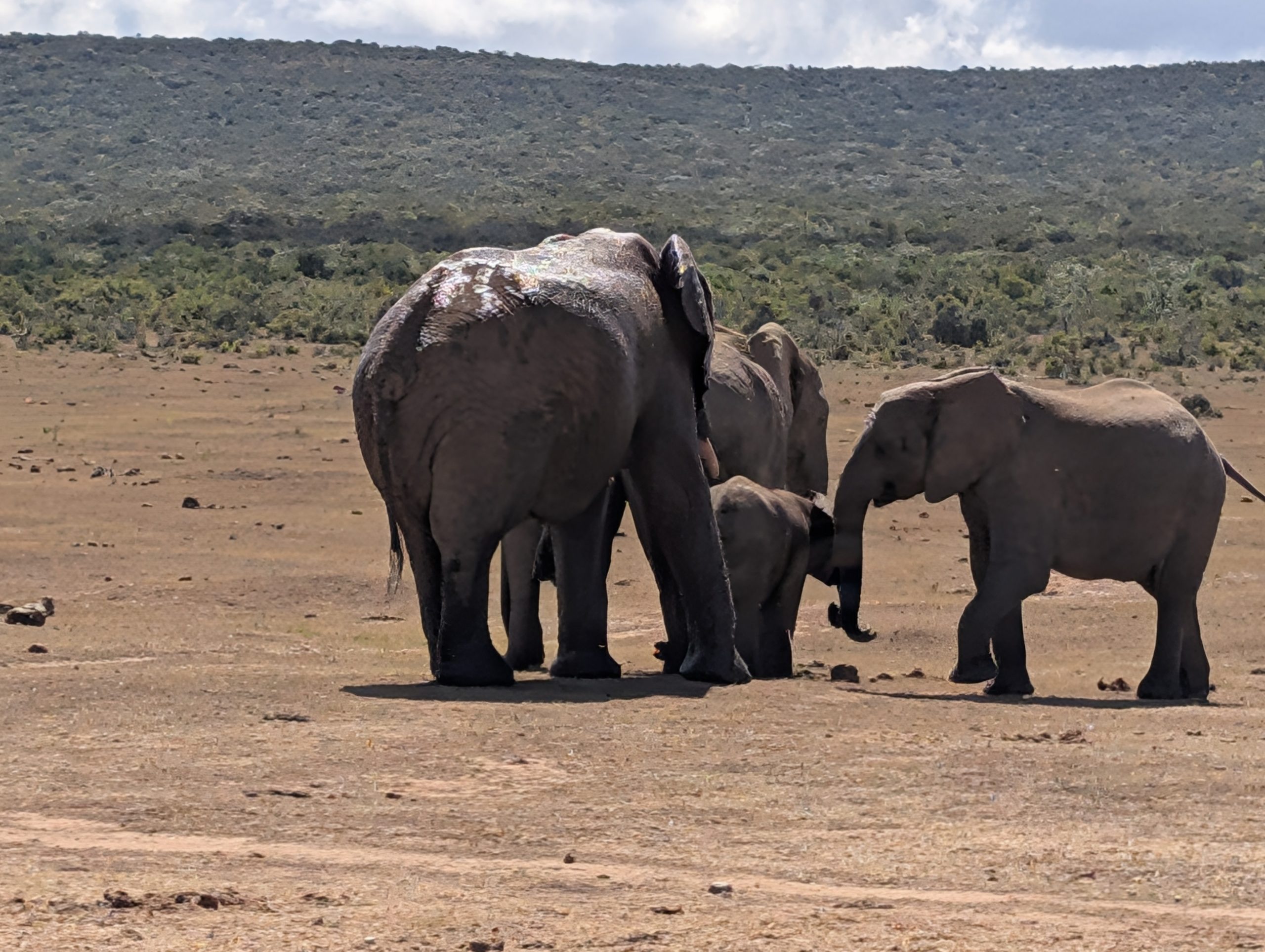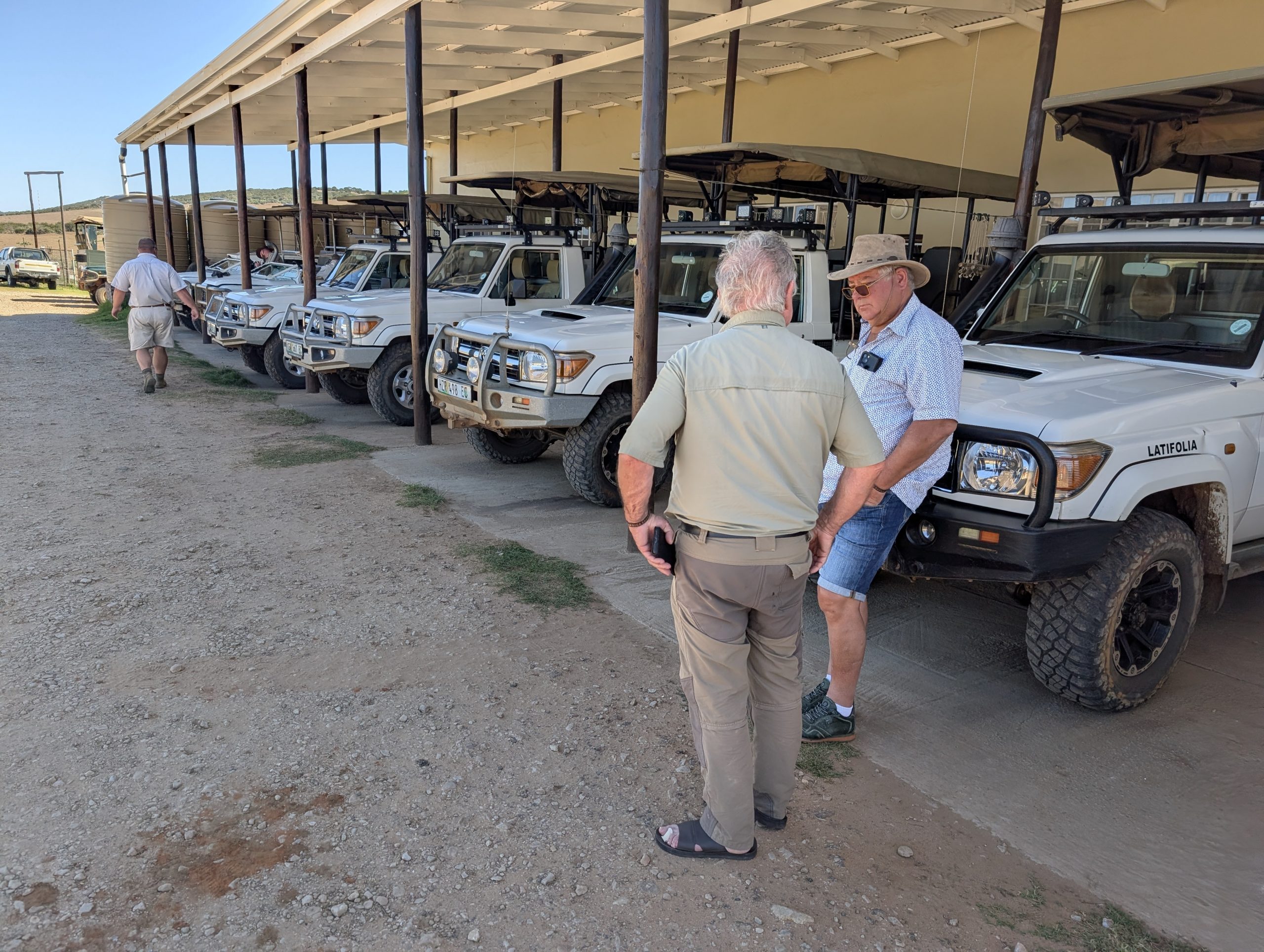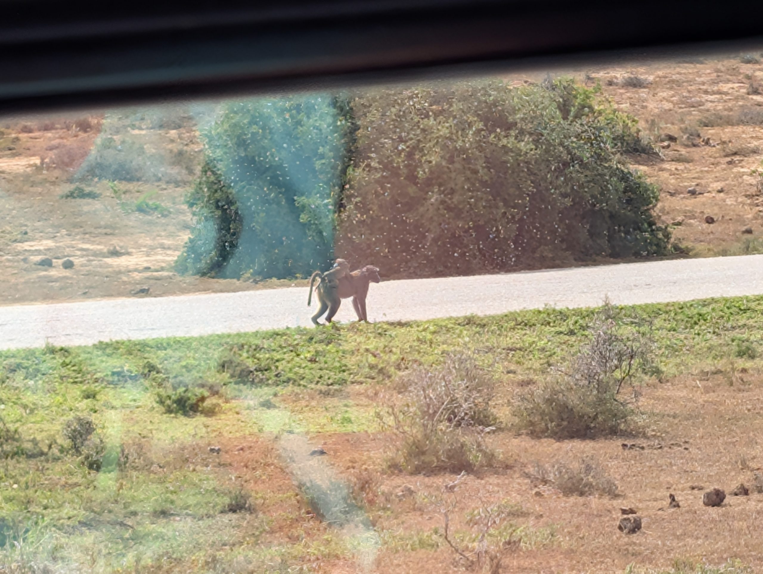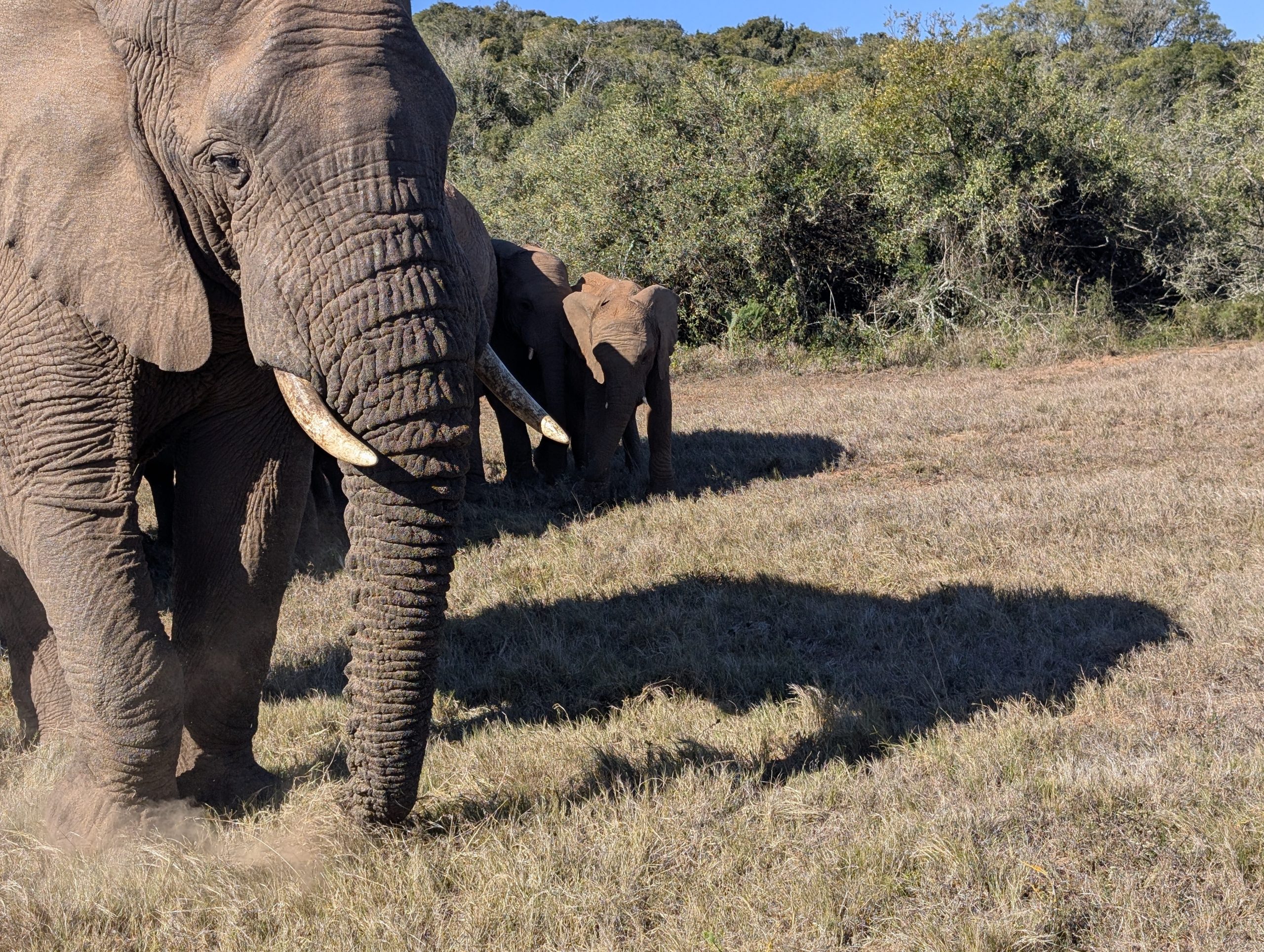Am 3. Tag beginnen wir mit einer Rücken Schulter Massage und anschließend Breakfast. Nun haben wir bis 13.45 Uhr Zeit zum Relaxen, bis unser Fahrer kommt. Uns holt ein Fahrer von Uber ab. Der war gut drauf. Eine ¾ Stunde fahren wir zur Schootia Privat Game Reserve. Pünktlich um 15 Uhr beginnt die Safari mit Roger. 9 Personen sind wir. Wir haben ganz viele verschiedene Tiere gesehen. Man hatte den Eindruck, dass alle Tiere einen Namen haben. Das Areal gehört mit zum Addo NP, ist aber im Privatbesitz. Wir haben auch Löwen 🦁 gesehen, die waren aber faul und haben geschlafen. Die Sonne scheint ganz schön toll, wir haben 34⁰. Dann haben wir viele Antilopen, Buffalos gesehen. Einmal haben wir 2 ausgewachsene Elefanten gesehen. Wir wollten schon weiter fahren, auf einmal kamen kleine Elefanten mit ihren Mamas aus dem Gebüsch. Die großen Elefanten kreisen die kleinen ganz schön ein und beschützen ihre Babys. Doch von dem aller kleinsten ist mir ein hervorragender Schnappschuss gelungen. Dann haben wir ein Nashorn gesehen, welches eine 6 Monate alte Tochter hatte. Hippos waren im Wasser und ein Krokodil. Die Safari ging bis 20 Uhr. Nun sind wir zu einem großen Zelt. Dort brannte Lagerfeuer und es gab gegrilltes. Einer hat wunderschöne Tierbilder gemalt. Gegen 21 Uhr waren wir wieder am Basislager und dort standen auch schon die Driver, die uns zurück in die Hotels brachten. Unser Fahrer ist gefahren wie der Teufel und hat kein Wort gesprochen. Es war insgesamt ein sehr schöner Tag.