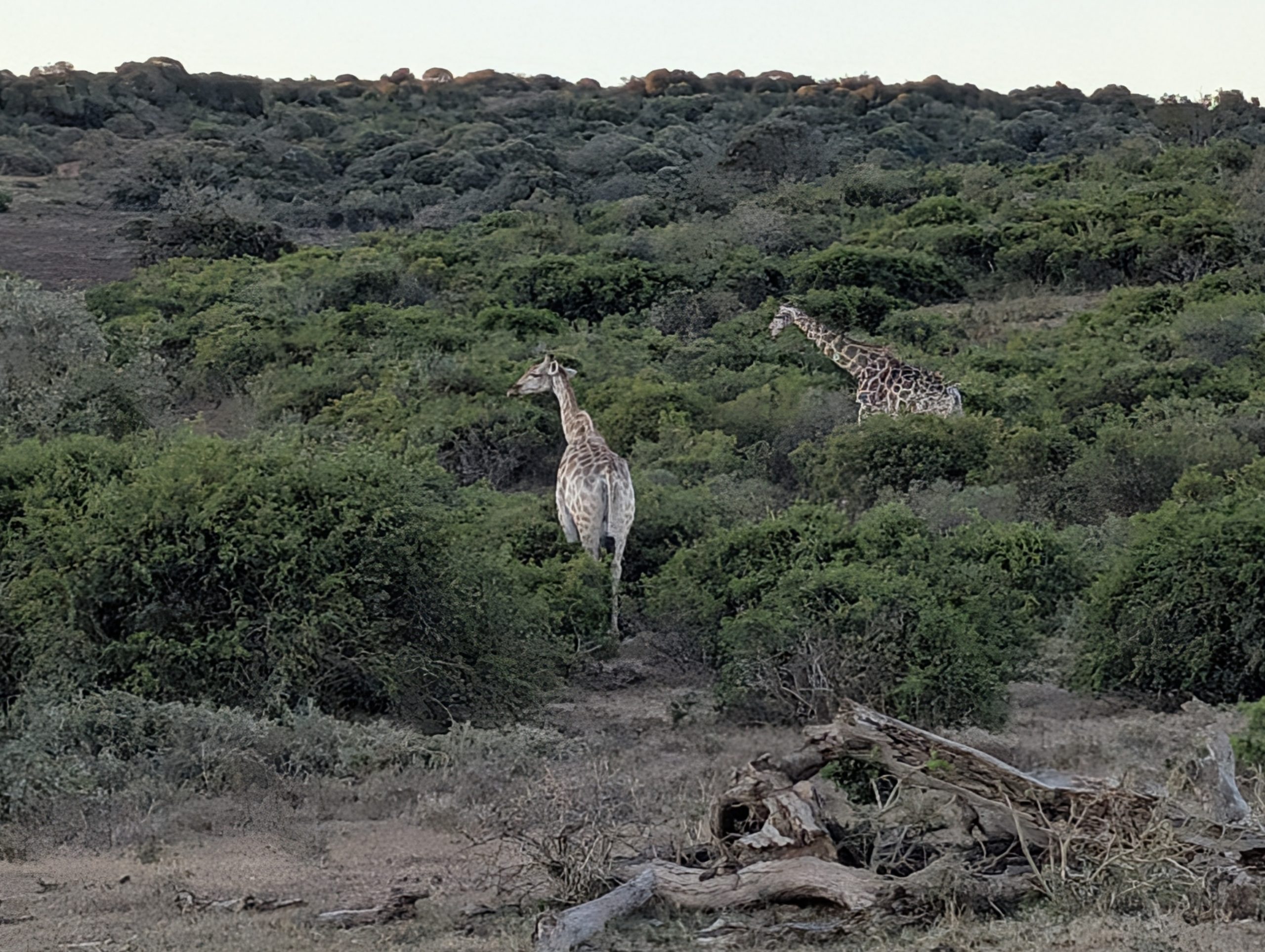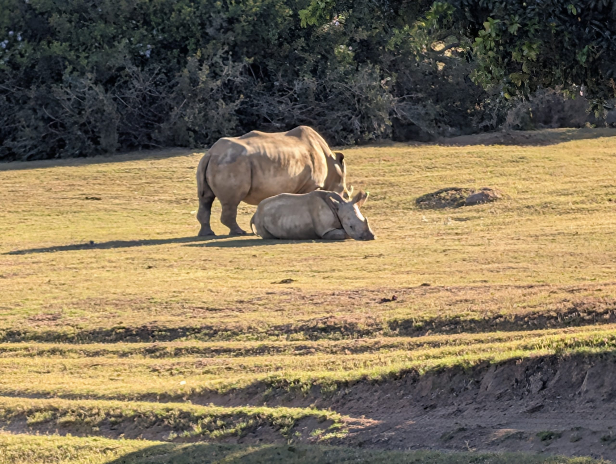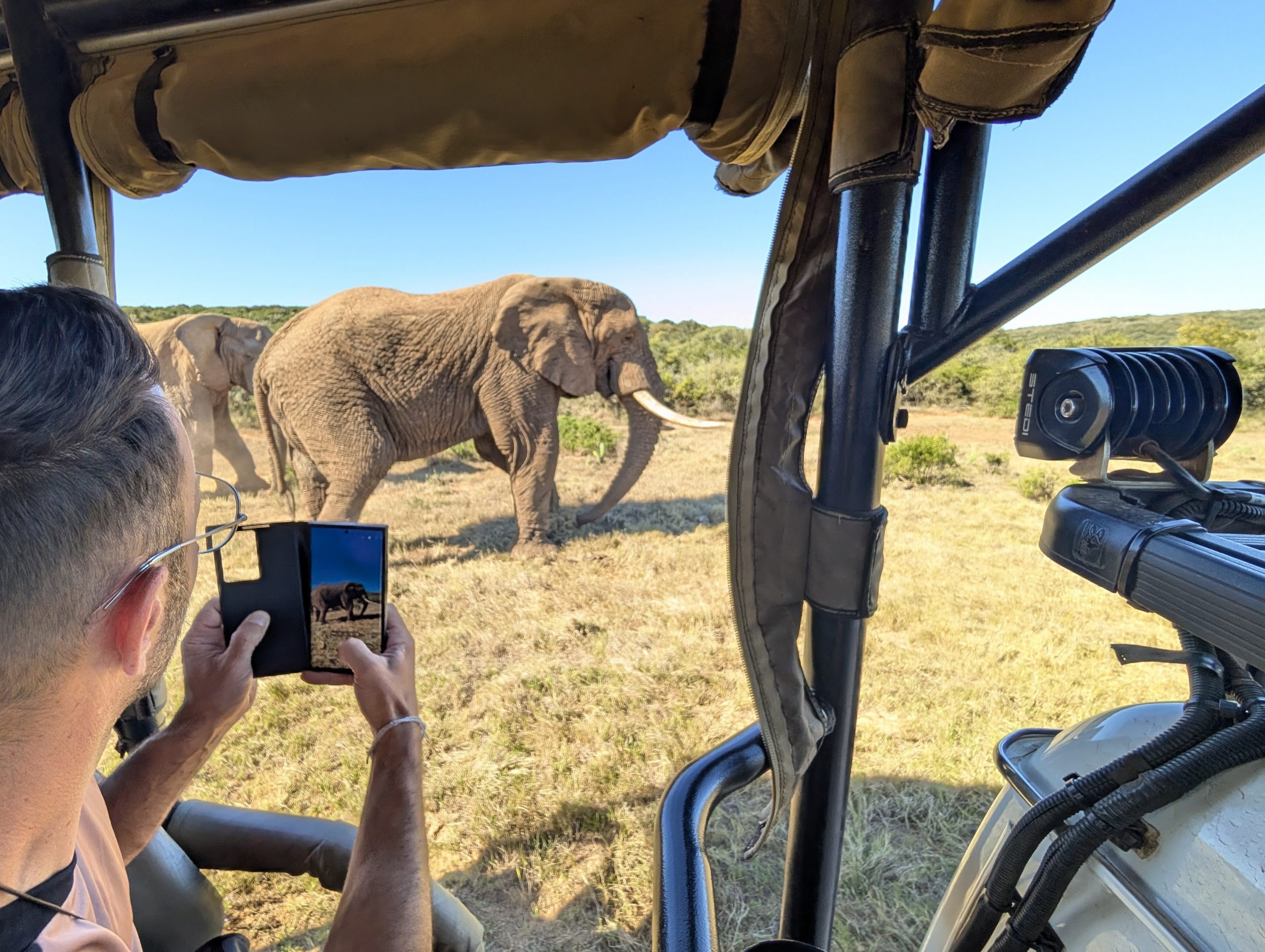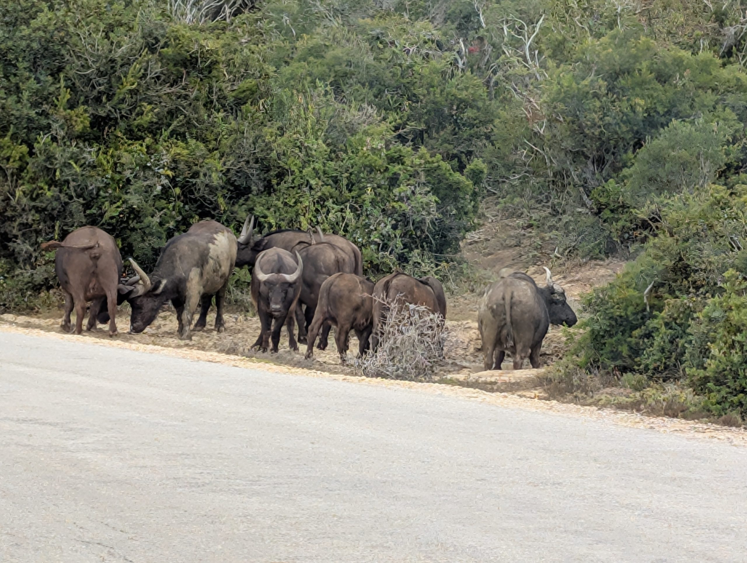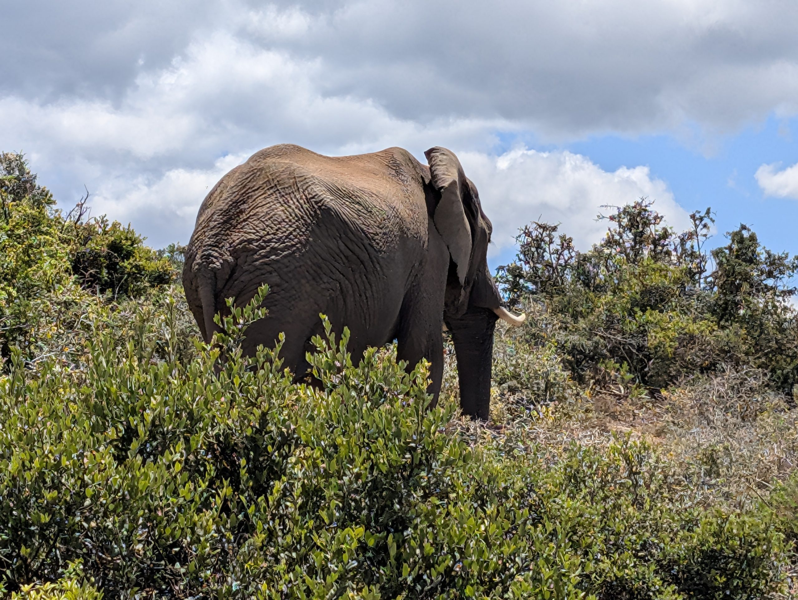 Am 3. Tag beginnen wir mit einer Rücken Schulter Massage und anschließend Breakfast. Nun haben wir bis 13.45 Uhr Zeit zum Relaxen, bis unser Fahrer kommt. Uns holt ein Fahrer von Uber ab. Der war gut drauf. Eine ¾ Stunde fahren wir zur Schootia Privat Game Reserve. Pünktlich um 15 Uhr beginnt die Safari mit Roger. 9 Personen sind wir. Wir haben ganz viele verschiedene Tiere gesehen. Man hatte den Eindruck, dass alle Tiere einen Namen haben. Das Areal gehört mit zum Addo NP, ist aber im Privatbesitz. Wir haben auch Löwen 🦁 gesehen, die waren aber faul und haben geschlafen. Die Sonne scheint ganz schön toll, wir haben 34⁰. Dann haben wir viele Antilopen, Buffalos gesehen. Einmal haben wir 2 ausgewachsene Elefanten gesehen. Wir wollten schon weiter fahren, auf einmal kamen kleine Elefanten mit ihren Mamas aus dem Gebüsch. Die großen Elefanten kreisen die kleinen ganz schön ein und beschützen ihre Babys. Doch von dem aller kleinsten ist mir ein hervorragender Schnappschuss gelungen. Dann haben wir ein Nashorn gesehen, welches eine 6 Monate alte Tochter hatte. Hippos waren im Wasser und ein Krokodil. Die Safari ging bis 20 Uhr. Nun sind wir zu einem großen Zelt. Dort brannte Lagerfeuer und es gab gegrilltes. Einer hat wunderschöne Tierbilder gemalt. Gegen 21 Uhr waren wir wieder am Basislager und dort standen auch schon die Driver, die uns zurück in die Hotels brachten. Unser Fahrer ist gefahren wie der Teufel und hat kein Wort gesprochen. Es war insgesamt ein sehr schöner Tag.