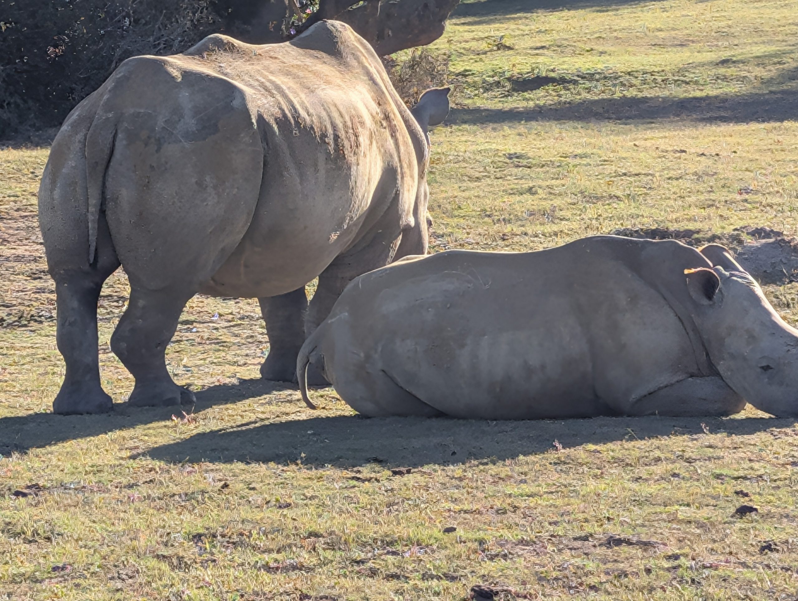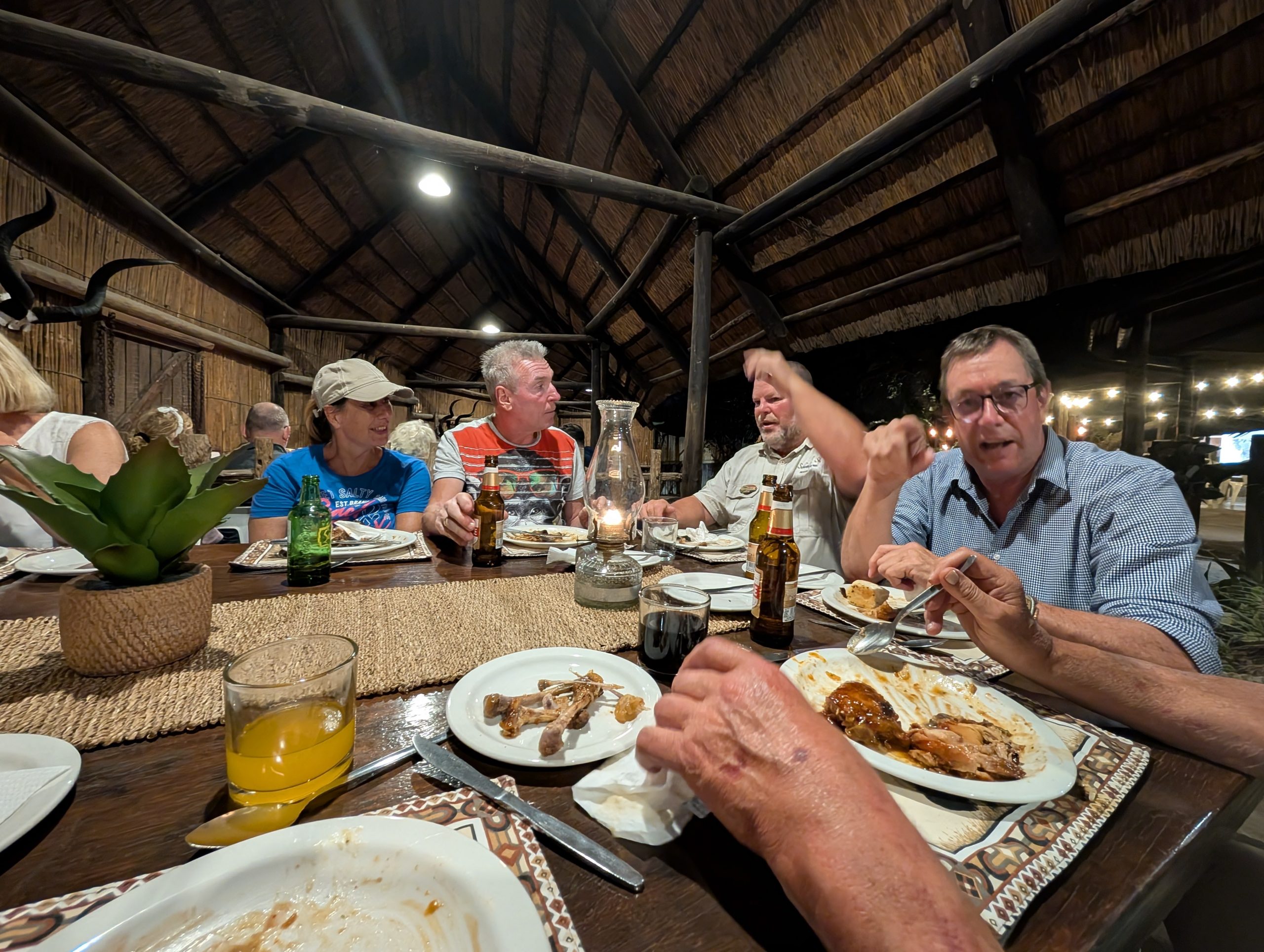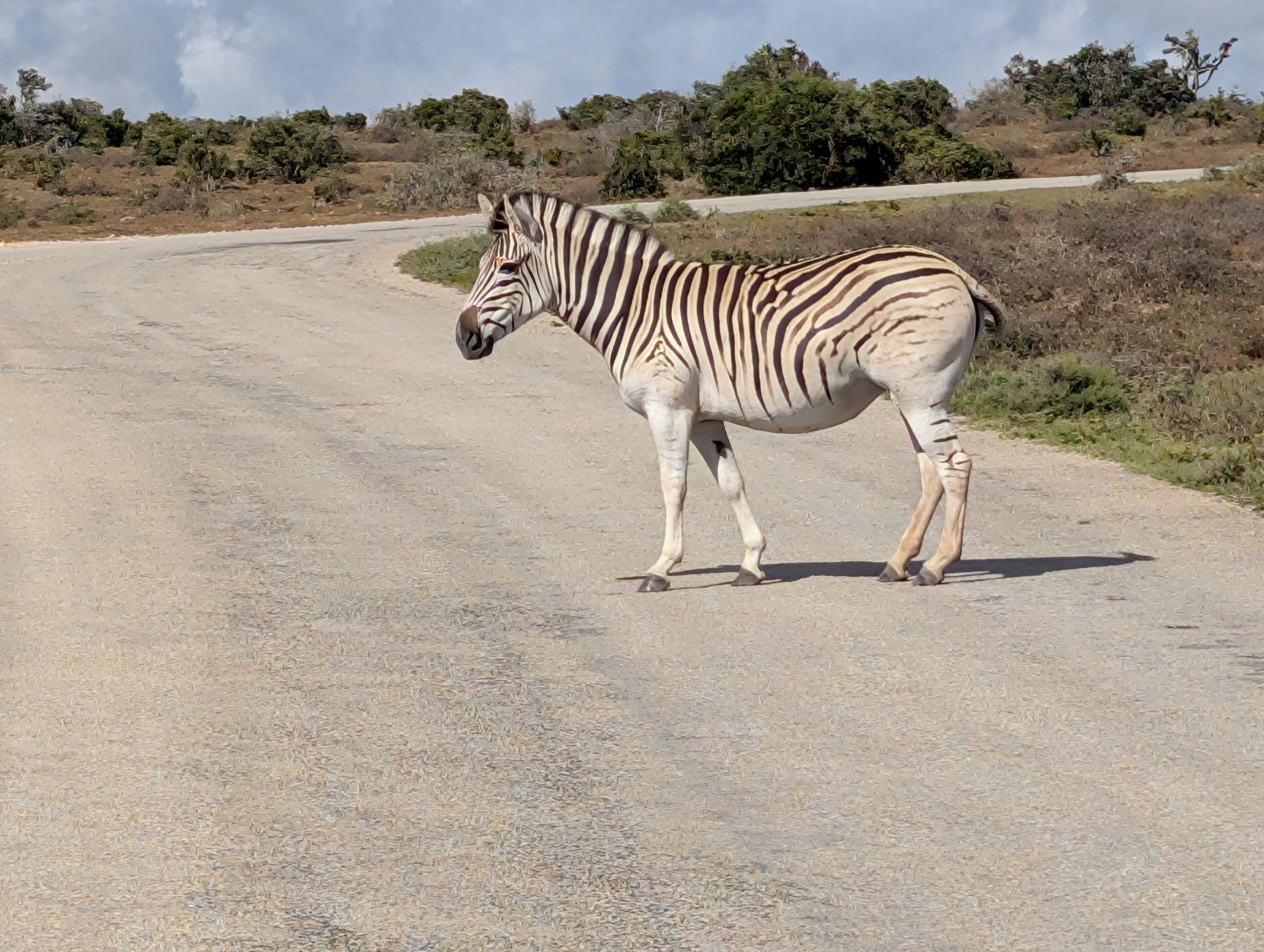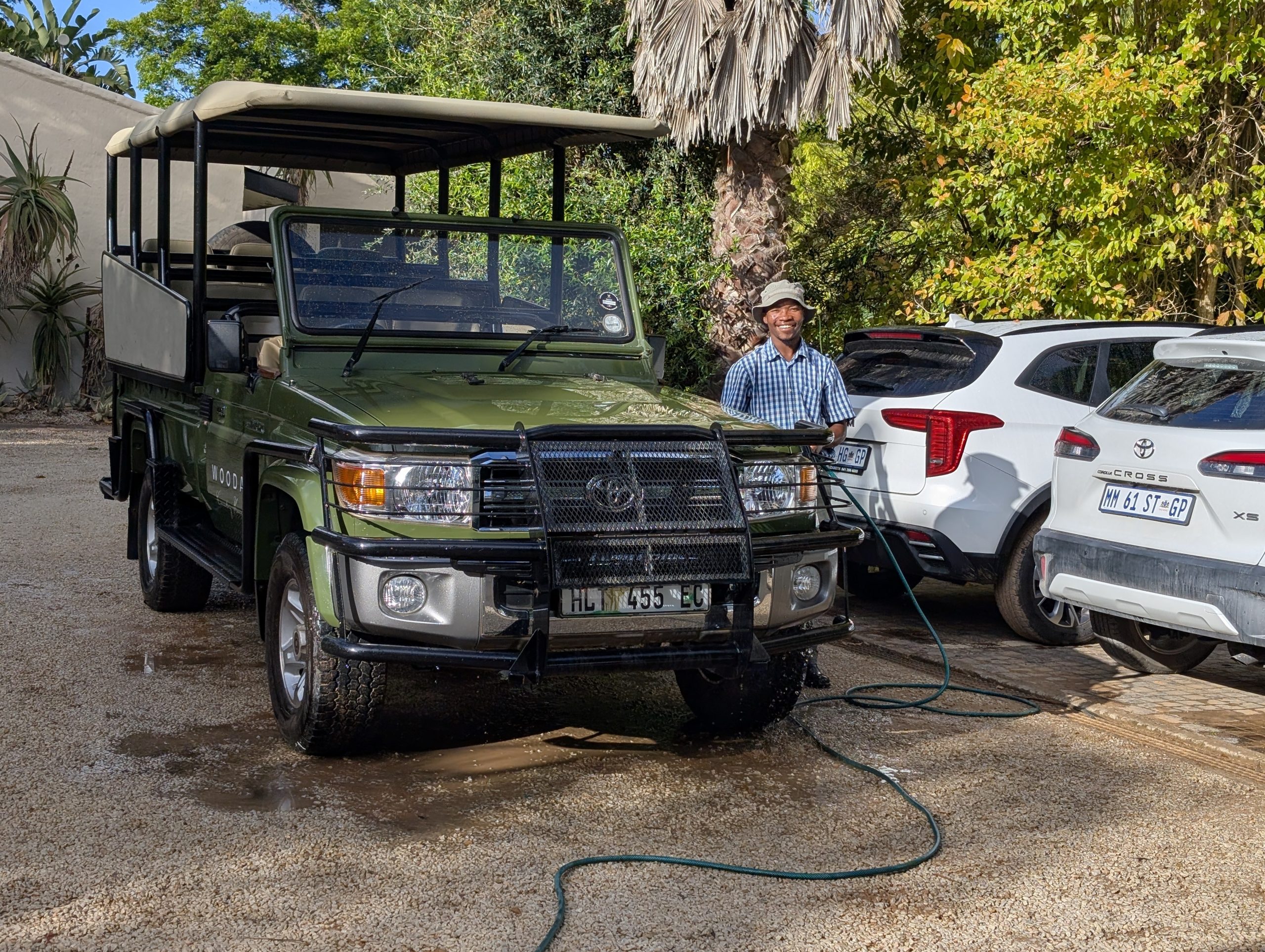 Am 3. Tag beginnen wir mit einer Rücken Schulter Massage und anschließend Breakfast. Nun haben wir bis 13.45 Uhr Zeit zum Relaxen, bis unser Fahrer kommt. Uns holt ein Fahrer von Uber ab. Der war gut drauf. Eine ¾ Stunde fahren wir zur Schootia Privat Game Reserve. Pünktlich um 15 Uhr beginnt die Safari mit Roger. 9 Personen sind wir. Wir haben ganz viele verschiedene Tiere gesehen. Man hatte den Eindruck, dass alle Tiere einen Namen haben. Das Areal gehört mit zum Addo NP, ist aber im Privatbesitz. Wir haben auch Löwen 🦁 gesehen, die waren aber faul und haben geschlafen. Die Sonne scheint ganz schön toll, wir haben 34⁰. Dann haben wir viele Antilopen, Buffalos gesehen. Einmal haben wir 2 ausgewachsene Elefanten gesehen. Wir wollten schon weiter fahren, auf einmal kamen kleine Elefanten mit ihren Mamas aus dem Gebüsch. Die großen Elefanten kreisen die kleinen ganz schön ein und beschützen ihre Babys. Doch von dem aller kleinsten ist mir ein hervorragender Schnappschuss gelungen. Dann haben wir ein Nashorn gesehen, welches eine 6 Monate alte Tochter hatte. Hippos waren im Wasser und ein Krokodil. Die Safari ging bis 20 Uhr. Nun sind wir zu einem großen Zelt. Dort brannte Lagerfeuer und es gab gegrilltes. Einer hat wunderschöne Tierbilder gemalt. Gegen 21 Uhr waren wir wieder am Basislager und dort standen auch schon die Driver, die uns zurück in die Hotels brachten. Unser Fahrer ist gefahren wie der Teufel und hat kein Wort gesprochen. Es war insgesamt ein sehr schöner Tag.