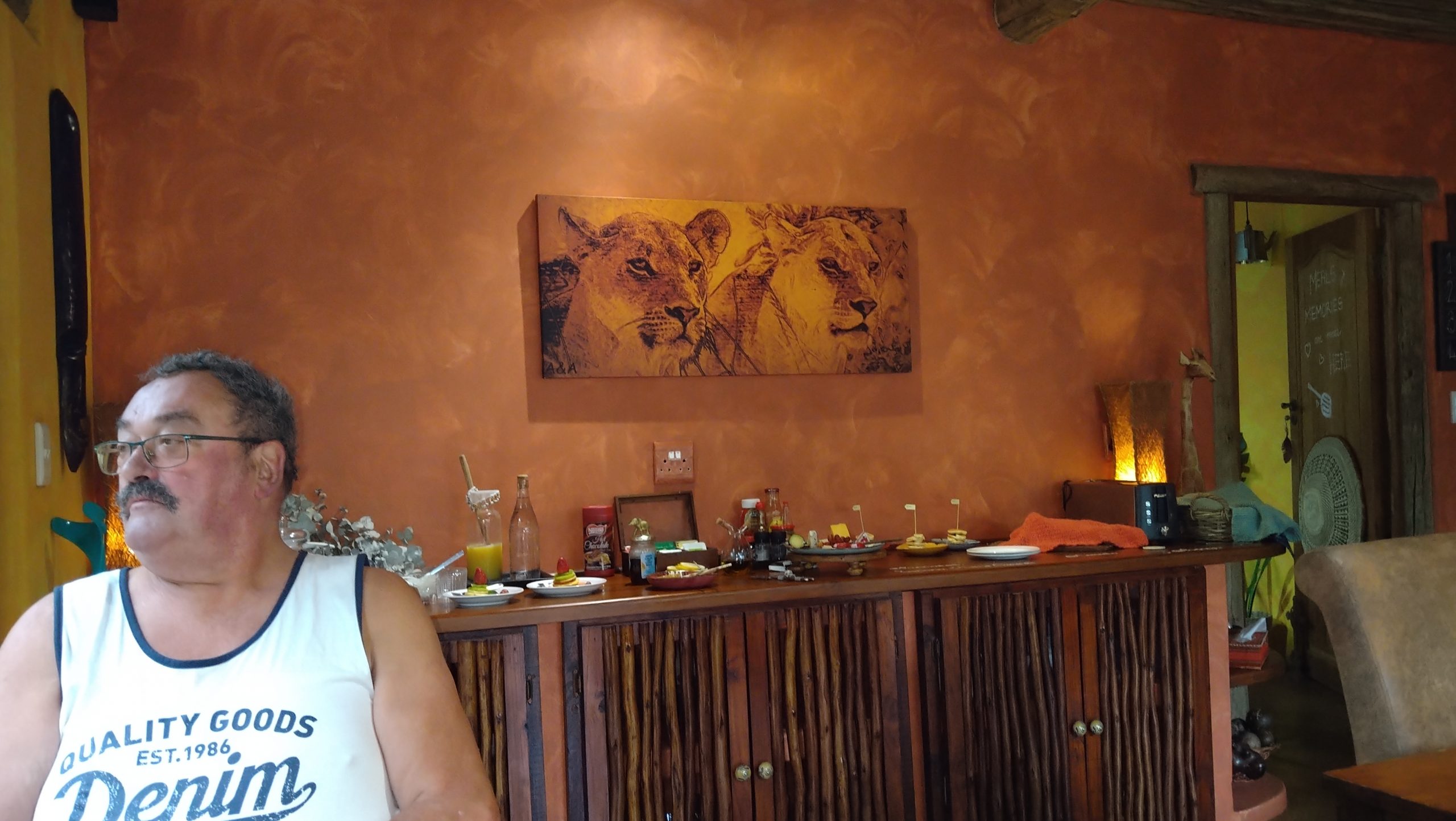 Der nächste morgen ging um 5 Uhr los, da sind wir mit einem Jeep abgeholt worden. Ach du liebe Schande, der war hoch und nur kleine Trittflächen, aber ich kam besser hoch, als ich dachte. Über 1 Stunde sind wir gefahren zum Hluhluwe- Imfolozi Park gefahren im Westlandpark. Hier haben wir eine Ganztagessafari und unser Guide hieß Sarbello. Viele Tiere bekamen wir zu sehen. Gegen 9 Uhr war erstmal Frühstückszeit. Es war an alles gedacht. Dann sind wir weiter auf Spurensuche nach Tieren und wir haben auch viele gesehen, sogar die Breitmaulnashörner haben wir gesehen. Sie waren Mal vom Aussterben bedroht gewesen, doch hier gelang wieder eine größere Population. Gegen 1 Uhr fing Sarbello mit einigen anderen Guides an zu grillen, man nennt das hier Braii, das afrikanische BBQ.  Ich habe Sarbello gefragt, ob wir die Rucksäcke mitnehmen sollen oder auf dem Auto lassen. Er meinte, dass wir den auf dem Auto lassen können. Als wir dann am Tisch saßen, sah ich, wie sich ein Monkeys ( Affe) mit meinem Rucksack beschäftigte, da ist Sarbello aber schnell gesprungen und hat ihn verjagt. Das Mittagessen war köstlich, es gab Würstchen, Steaks, Kartoffelsalat, Nudelsalat, Tomatensalat, Obst, Bier, Wein und alkoholfreie Getränke. Dann ging es weiter bis 16 Uhr im Park. Gegen 17.30 Uhr waren wir wieder in St. Lucia und dort gingen wir in einem Hipporestaurant in der McKenzie Road Abendessen. Am nächsten Morgen war schon wieder das letzte Frühstück bei Marie und Adrian. Sie machen alles mit so viel Liebe im Detail, die Marmeladen macht sie selber und vieles andere mehr. Die beiden Hunde haben sich sehr um uns bemüht. Sie haben es gemerkt, wer es gut mit ihnen meint. Die größere war die Lina, ein braves Mädchen und der kleine neugierige Rambo. Marie hat beiden eine Fliege gestrickt als Halsband. Dann packten wir unsere Sachen zusammen und Marie brachte mir noch meine Wäsche, frisch gewaschen und gebügelt für ganz wenig Geld. Die beiden waren so herzlich und Norbert sang für sie noch das Lied “ Marie, Marie“ von Shakin Stevens. Nun hieß es leider wieder Abschied nehmen von diesen tollen Menschen.