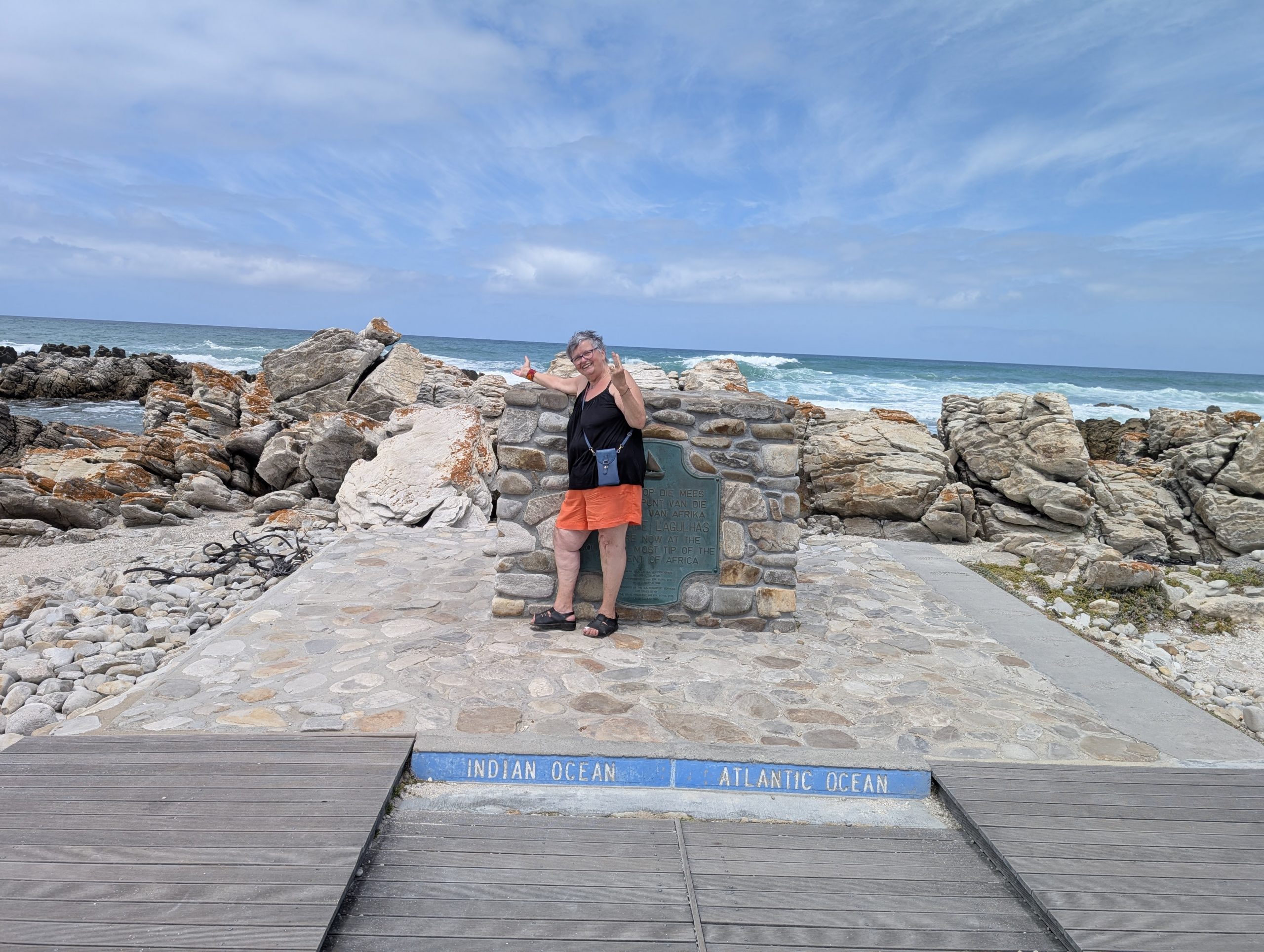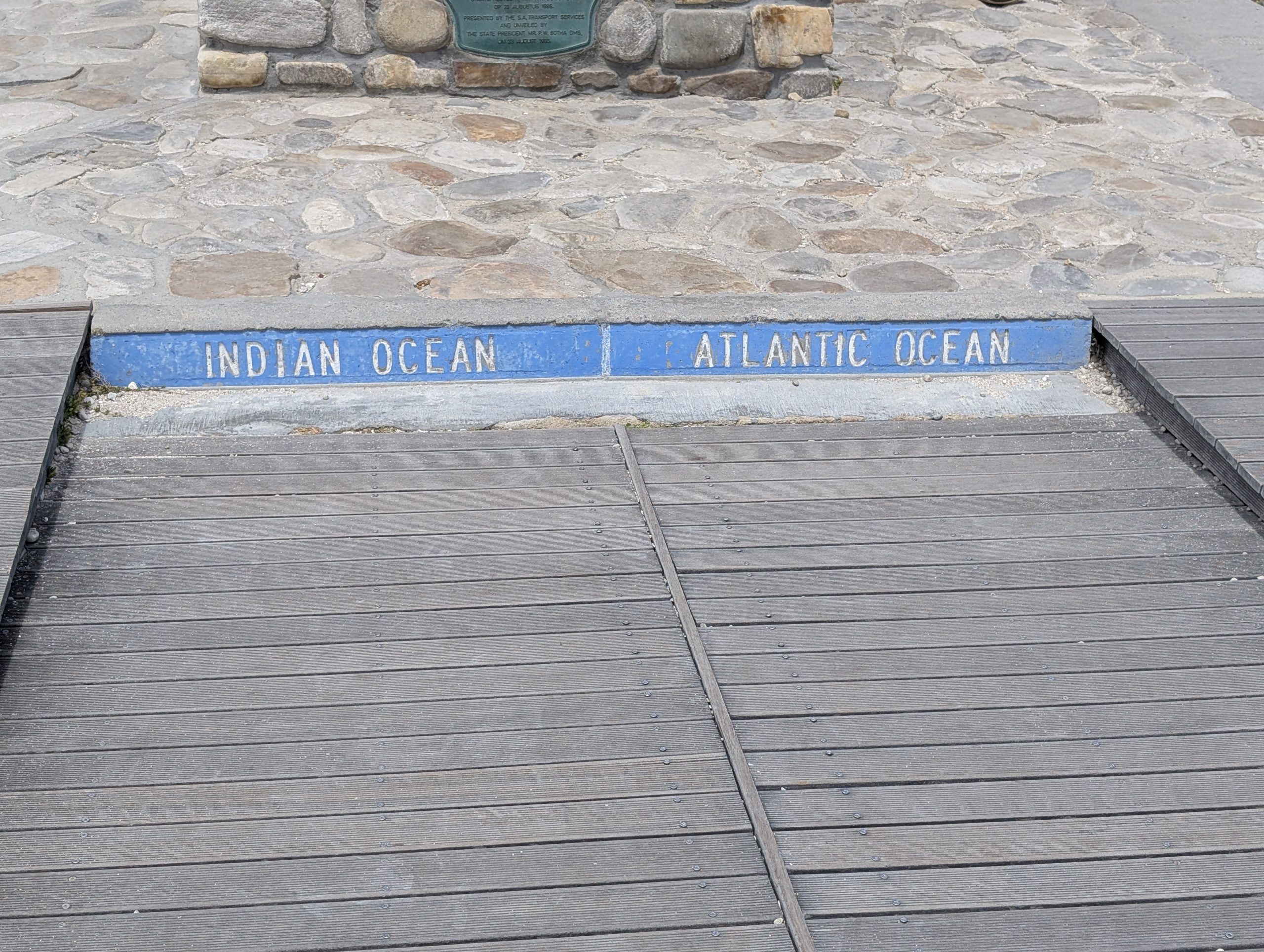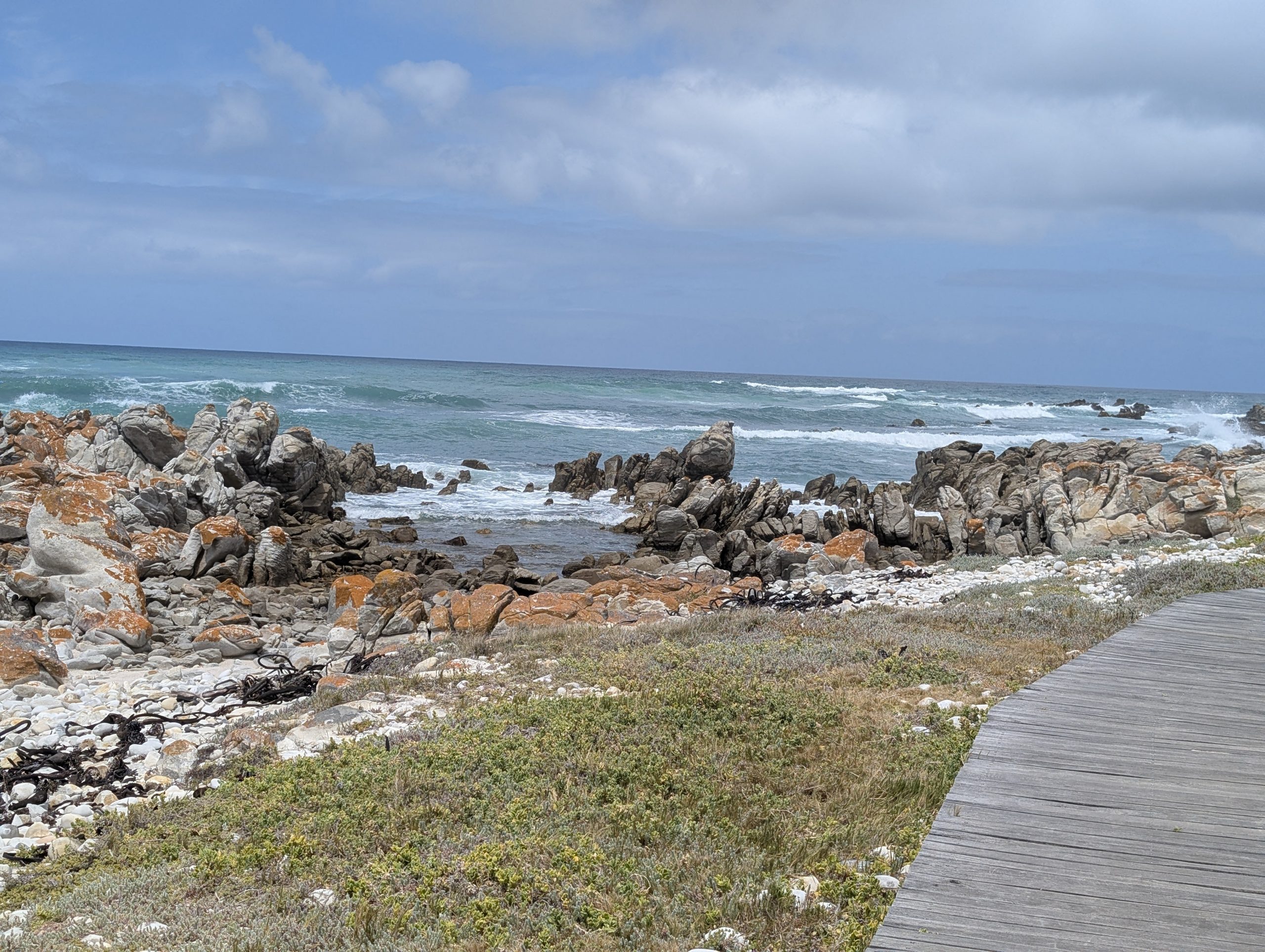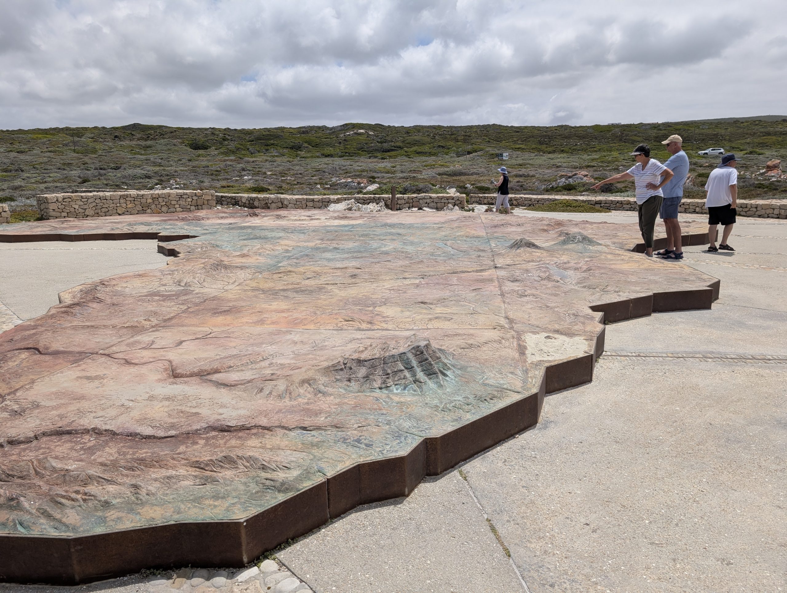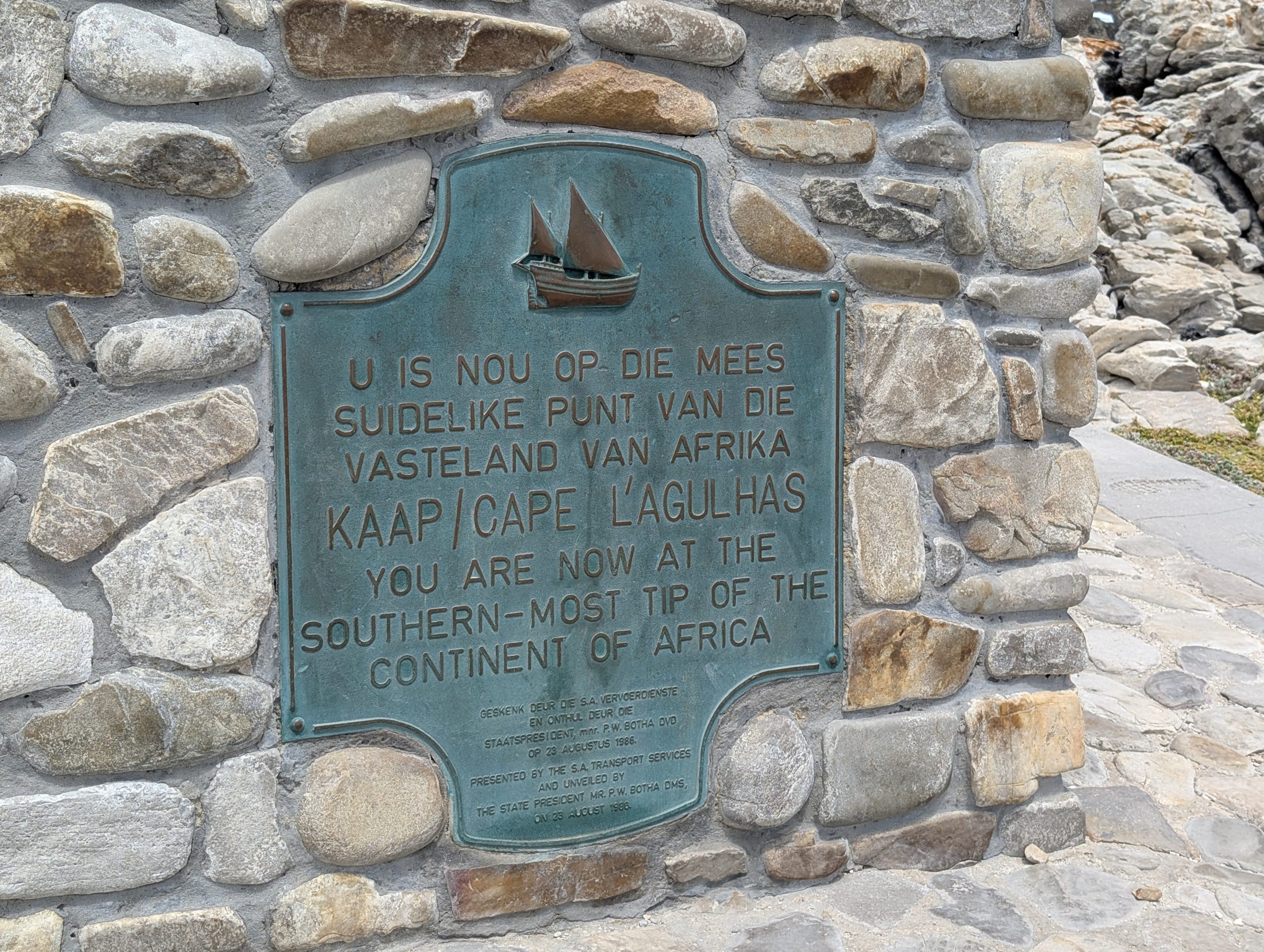 Nun müssen wir schon wieder weiter ziehen. Von unserer Gastwirtin erfuhren wir noch, dass wir unbedingt zum Cape Agulhas sollen, da es auf unserem Weg nach Wilderness liegt. Denn dort ist das Kap der guten Hoffnung, der southermost Point of Afrika. Viele denken nämlich, der ist an der Südspitze der Kaphalbinsel. Natürlich sind wir dahin, das stand eh auf meinem Wunschzettel. Ich dachte aber auch nicht, dass das so weit weg von der Kaphalbinsel ist. Ich habe noch schnell Melanie angeschrieben, ob wir das auf unserer Tour auf der Kaphalbinsel mit sehen, doch sie klärte mich auf, dass das viel zu weit weg ist. Wir fuhren also hin und es war ein toller Weg aus Brettern. Ich bin los gelaufen. Norbert meinte, dass er das nicht schaffen werde. Ich soll mir wieder Zeit lassen. Die Schmerzen von dem Sturz diese Woche waren schon gewaltig. Der Weg war ca. 3 km, für Gesunde gar kein Problem. Zwischendurch waren auch noch große Steine, ich bin wie auf rohen Eiern gelaufen. Ich hatte so eine Angst wieder zu fallen. Doch irgendwann habe ich den Punkt erreicht und es machte mich stolz. Es war eine Riesensteinplatte gewesen, die den Kontinent Afrika zeigte. In der Mitte an der Ostseite waren 2 Erhebungen, man erkannte den Kilimandscharo in Tansania und den Mt. kenia in Kenia genau auf dem Äquator. Weiter vorn waren 2 Schriftplatten, die rechte zeigte den Atlantik und die linke zeigte den indischen Ozean an. Das war nun das Kap der guten Hoffnung, eine sehr schwere Schiffspassage. Hier sind schon unzählige Schiffe gesunken, trotz des Leuchtturmes Agulhas, der älteste von Afrika. Nun wird es aber Zeit, den Rückzug anzutreten, wir haben heute noch eine weite Strecke zu fahren. Norbert hat mich sogar abgeholt, dort wo der Steinweg war. Ich war froh und dankbar, dass ich da nicht nochmal drüber musste. In dem Ort haben wir noch Kaffee getrunken und ein Eis gegessen. Nun wurde es aber Zeit. Das Navi sagte uns, noch 4,5 Stunden sind zu fahren. 17:30 erreichen wir den Ort Wilderness und unsere Lodge, das Dune Beach House. Wir haben mehrere Male geklingelt, keiner machte auf. Da sagte Norbert, ich soll Mal anrufen, Gott sei Dank habe ich ja eine afrikanische SIM Karte. Wir haben uns schnell eingerichtet. Wir haben die Gastwirtin gefragt, wo wir Abendessen gehen können, da hat hat sie uns sogar einen Fahrer mit angeboten. Das haben wir gerne angenommen. Die Gaststätte war toll. Norbert aß wieder Seafood, irgendwas mit Calamar und mir hat der Kellner Antilope empfohlen. Ich aß ein Steak mit Antilope und ein Steak mit Strauß, absolute Spitze. Als wir fertig waren, ließen wir den Fahrer wieder kommen und er fuhr uns wieder nach Hause. Wir waren ganz schön fertig und gingen beizeiten schlafen.