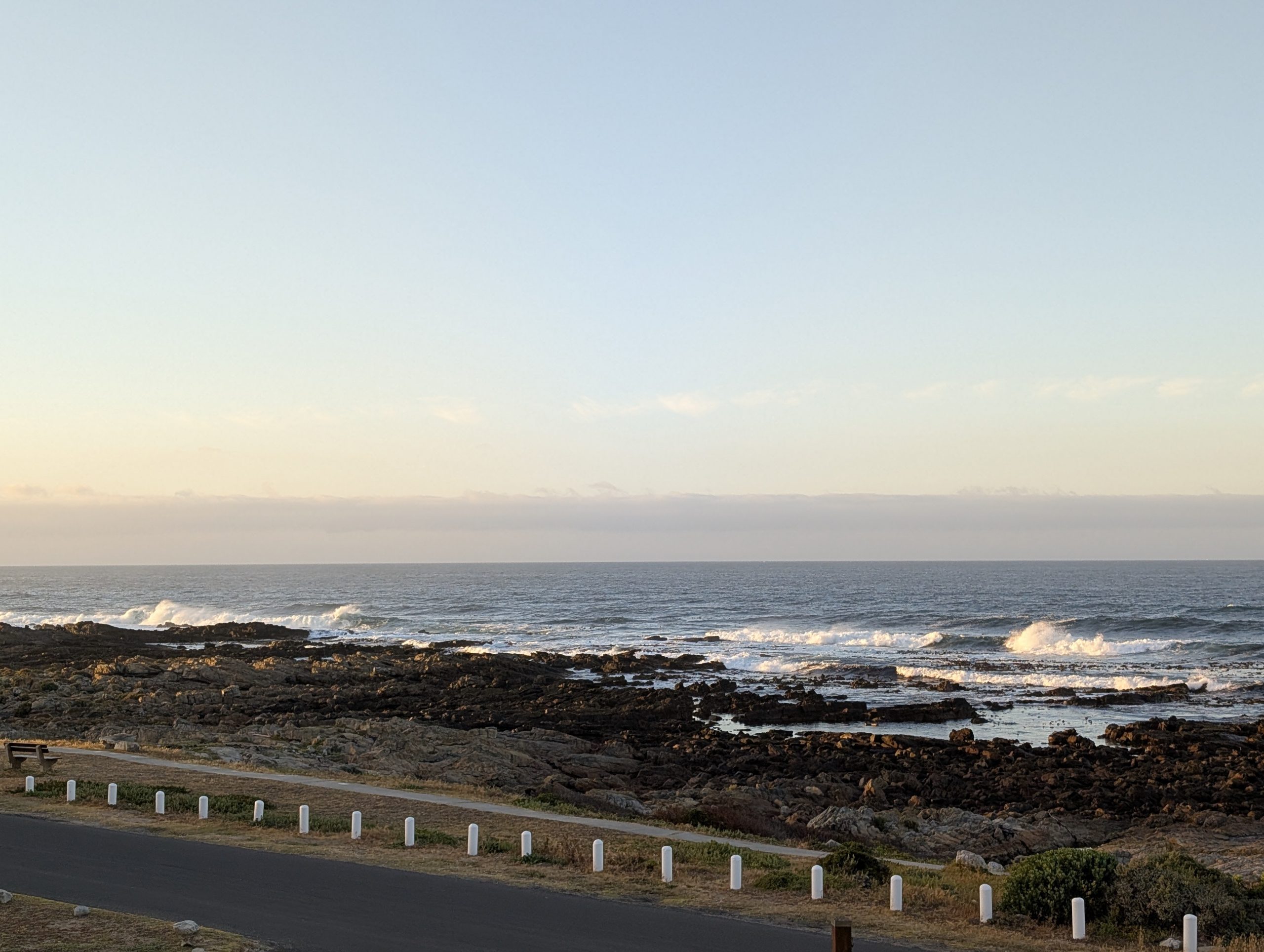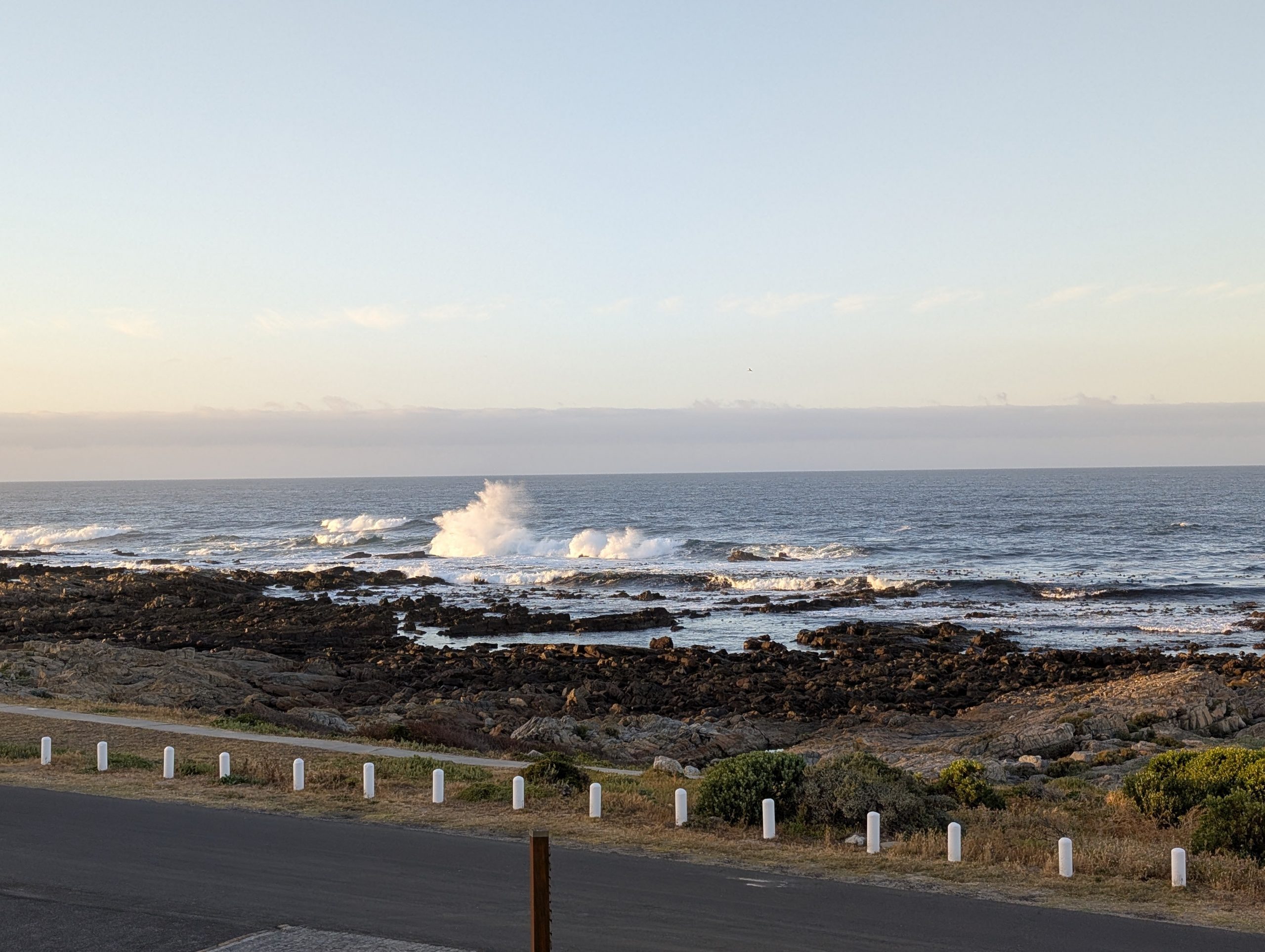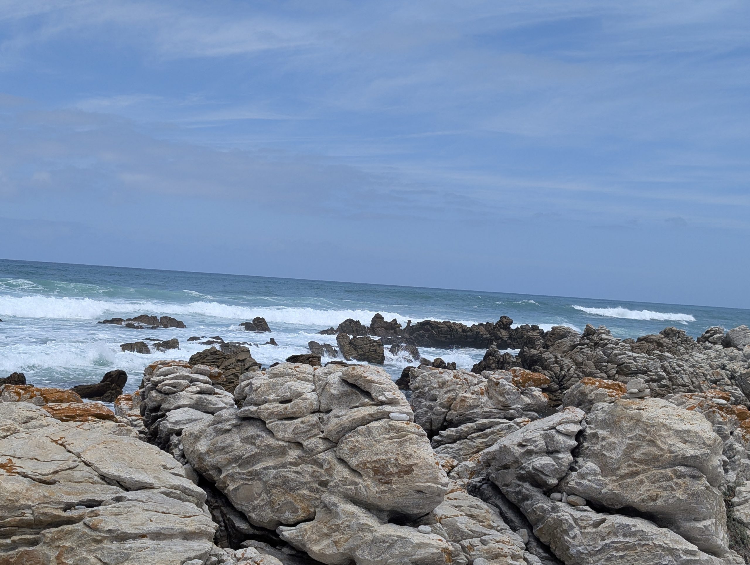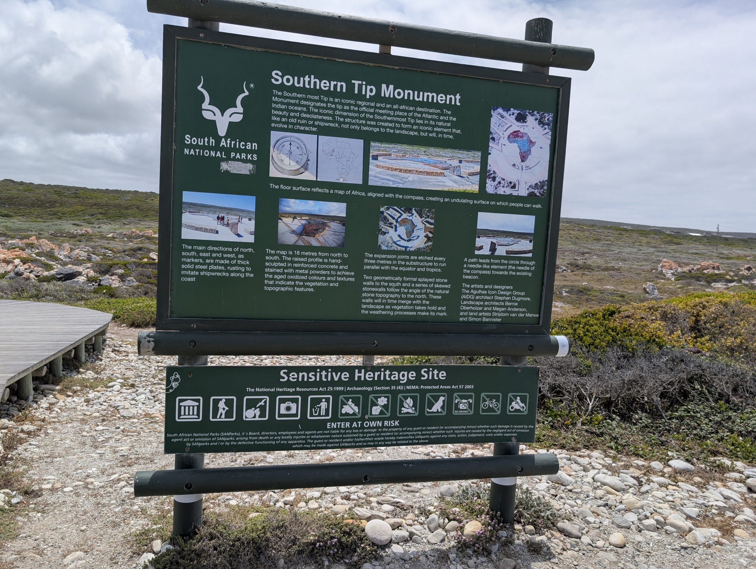 Nun müssen wir schon wieder weiter ziehen. Von unserer Gastwirtin erfuhren wir noch, dass wir unbedingt zum Cape Agulhas sollen, da es auf unserem Weg nach Wilderness liegt. Denn dort ist das Kap der guten Hoffnung, der southermost Point of Afrika. Viele denken nämlich, der ist an der Südspitze der Kaphalbinsel. Natürlich sind wir dahin, das stand eh auf meinem Wunschzettel. Ich dachte aber auch nicht, dass das so weit weg von der Kaphalbinsel ist. Ich habe noch schnell Melanie angeschrieben, ob wir das auf unserer Tour auf der Kaphalbinsel mit sehen, doch sie klärte mich auf, dass das viel zu weit weg ist. Wir fuhren also hin und es war ein toller Weg aus Brettern. Ich bin los gelaufen. Norbert meinte, dass er das nicht schaffen werde. Ich soll mir wieder Zeit lassen. Die Schmerzen von dem Sturz diese Woche waren schon gewaltig. Der Weg war ca. 3 km, für Gesunde gar kein Problem. Zwischendurch waren auch noch große Steine, ich bin wie auf rohen Eiern gelaufen. Ich hatte so eine Angst wieder zu fallen. Doch irgendwann habe ich den Punkt erreicht und es machte mich stolz. Es war eine Riesensteinplatte gewesen, die den Kontinent Afrika zeigte. In der Mitte an der Ostseite waren 2 Erhebungen, man erkannte den Kilimandscharo in Tansania und den Mt. kenia in Kenia genau auf dem Äquator. Weiter vorn waren 2 Schriftplatten, die rechte zeigte den Atlantik und die linke zeigte den indischen Ozean an. Das war nun das Kap der guten Hoffnung, eine sehr schwere Schiffspassage. Hier sind schon unzählige Schiffe gesunken, trotz des Leuchtturmes Agulhas, der älteste von Afrika. Nun wird es aber Zeit, den Rückzug anzutreten, wir haben heute noch eine weite Strecke zu fahren. Norbert hat mich sogar abgeholt, dort wo der Steinweg war. Ich war froh und dankbar, dass ich da nicht nochmal drüber musste. In dem Ort haben wir noch Kaffee getrunken und ein Eis gegessen. Nun wurde es aber Zeit. Das Navi sagte uns, noch 4,5 Stunden sind zu fahren. 17:30 erreichen wir den Ort Wilderness und unsere Lodge, das Dune Beach House. Wir haben mehrere Male geklingelt, keiner machte auf. Da sagte Norbert, ich soll Mal anrufen, Gott sei Dank habe ich ja eine afrikanische SIM Karte. Wir haben uns schnell eingerichtet. Wir haben die Gastwirtin gefragt, wo wir Abendessen gehen können, da hat hat sie uns sogar einen Fahrer mit angeboten. Das haben wir gerne angenommen. Die Gaststätte war toll. Norbert aß wieder Seafood, irgendwas mit Calamar und mir hat der Kellner Antilope empfohlen. Ich aß ein Steak mit Antilope und ein Steak mit Strauß, absolute Spitze. Als wir fertig waren, ließen wir den Fahrer wieder kommen und er fuhr uns wieder nach Hause. Wir waren ganz schön fertig und gingen beizeiten schlafen.