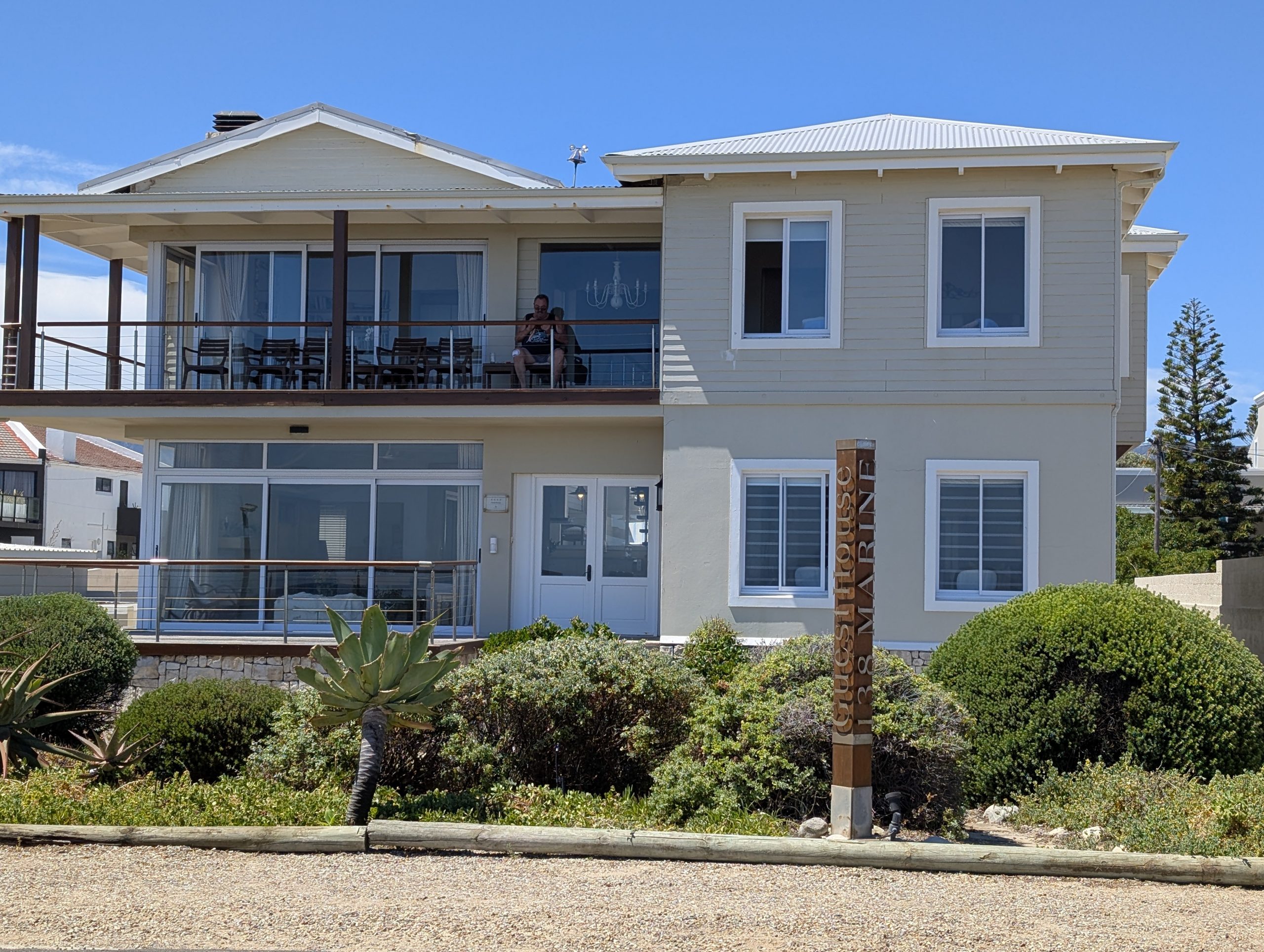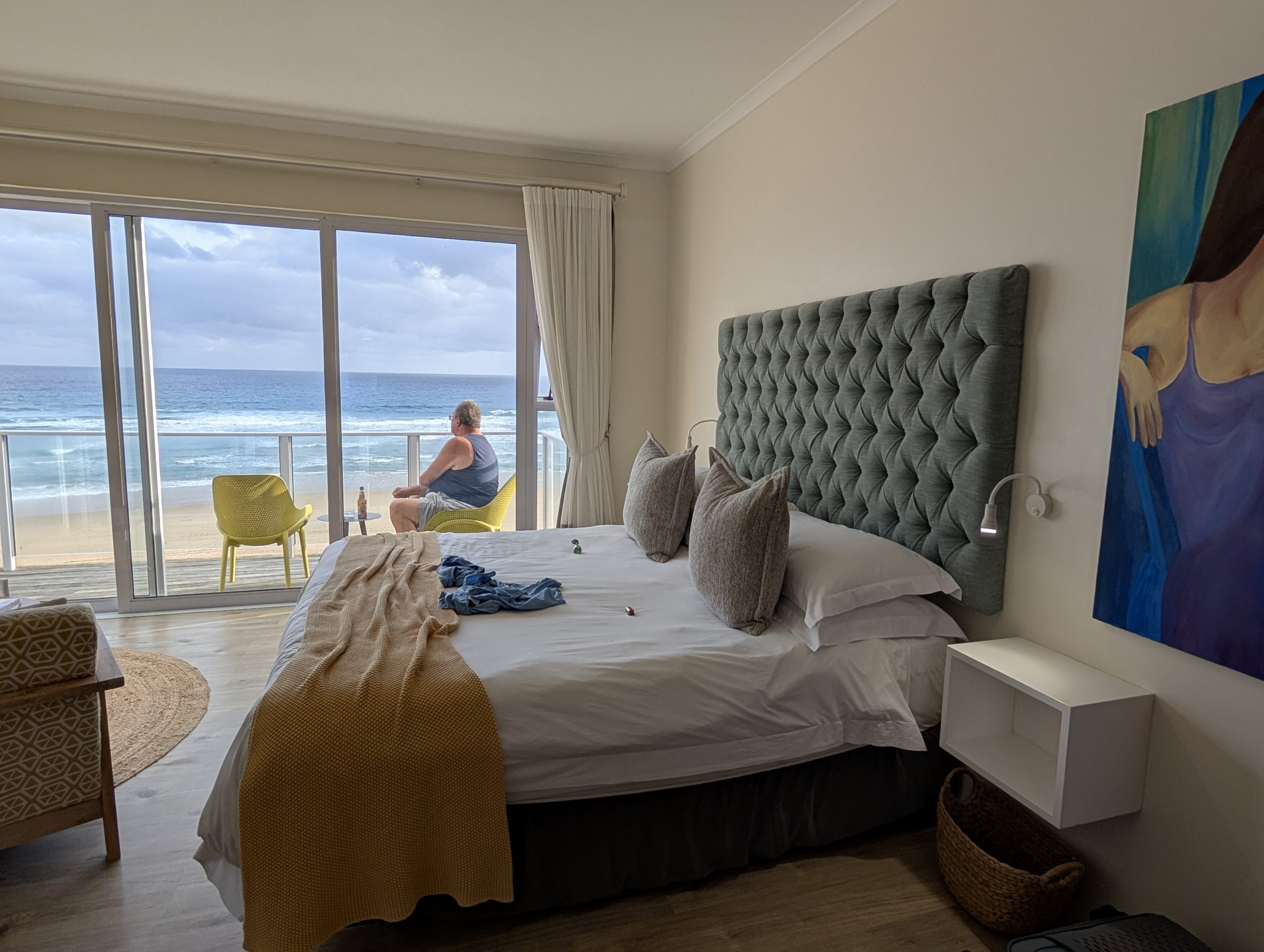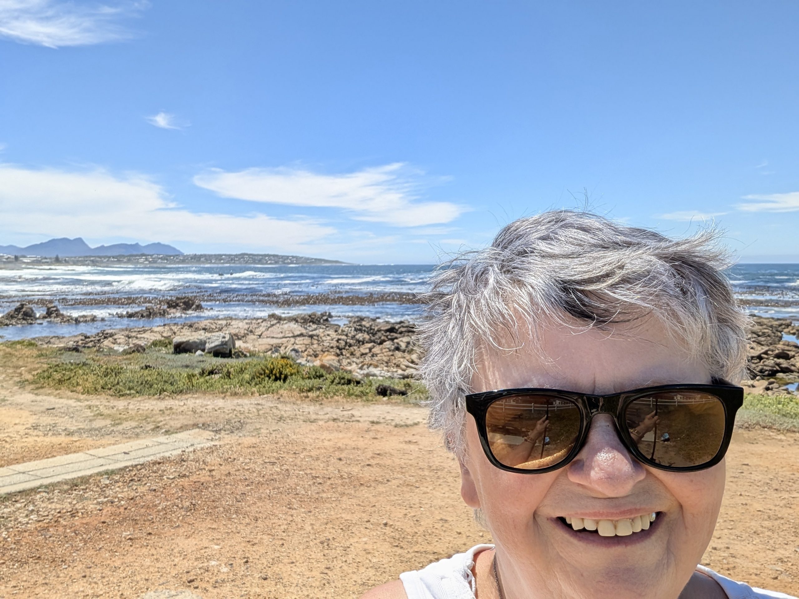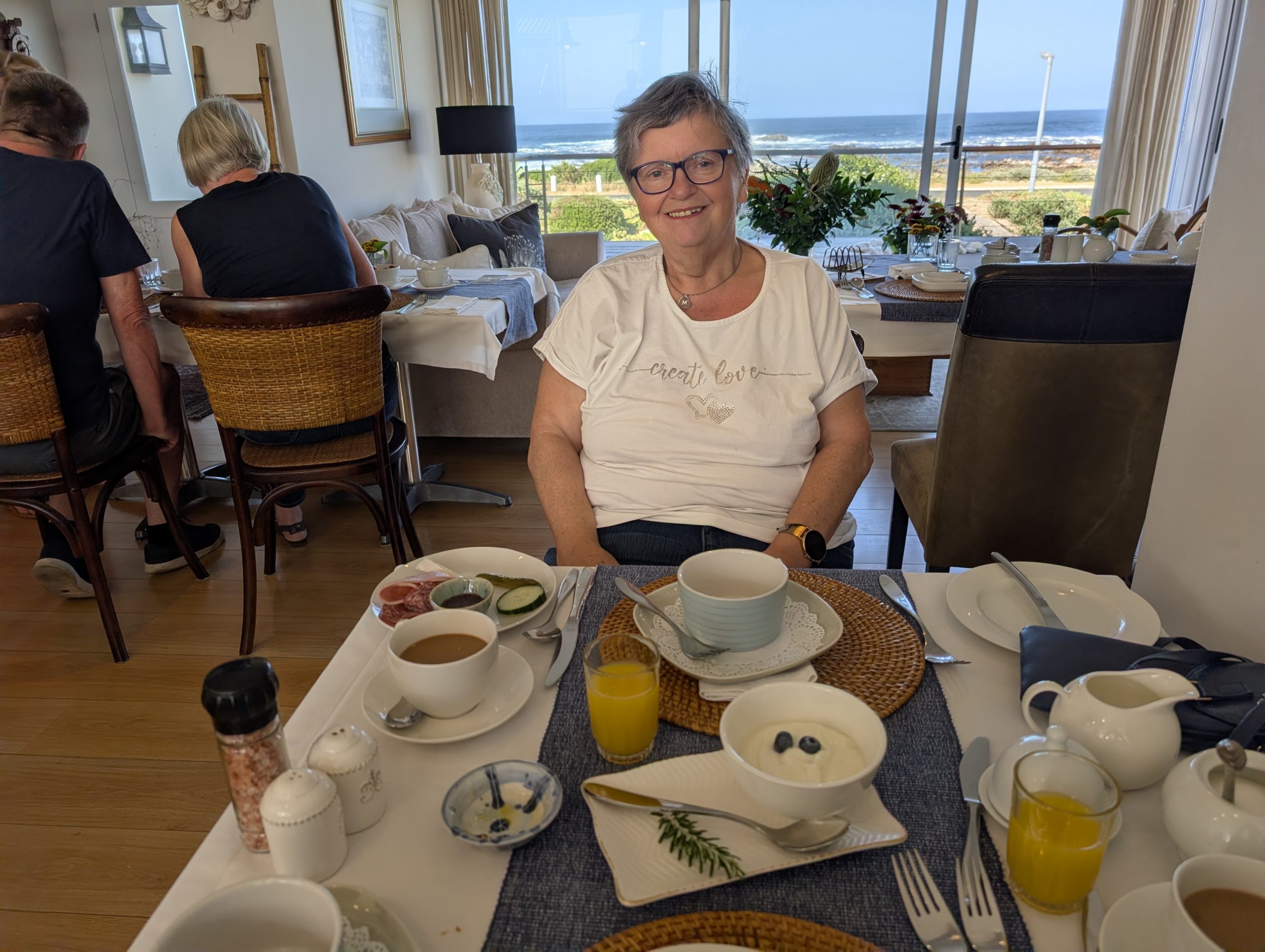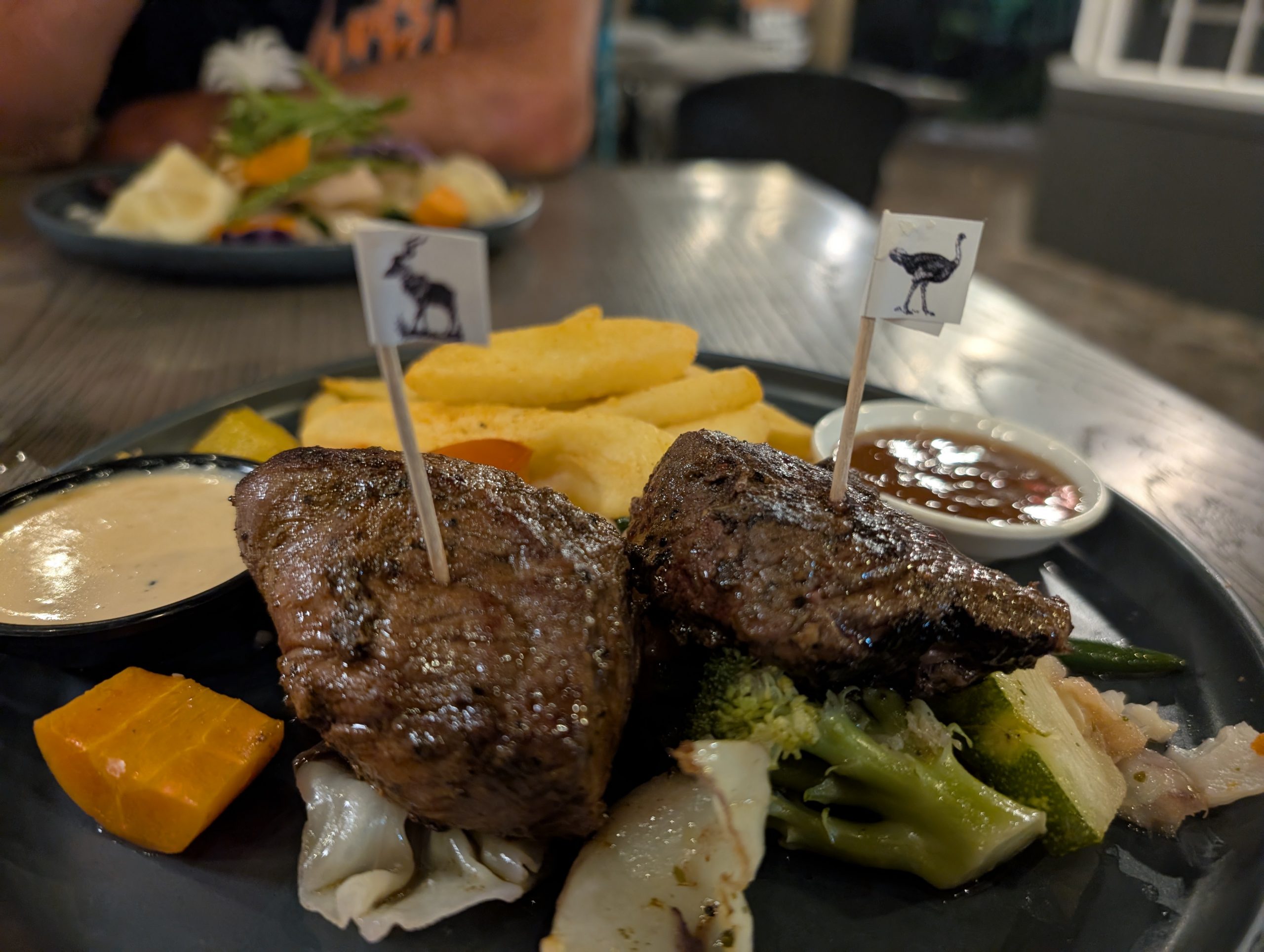 Nun müssen wir schon wieder weiter ziehen. Von unserer Gastwirtin erfuhren wir noch, dass wir unbedingt zum Cape Agulhas sollen, da es auf unserem Weg nach Wilderness liegt. Denn dort ist das Kap der guten Hoffnung, der southermost Point of Afrika. Viele denken nämlich, der ist an der Südspitze der Kaphalbinsel. Natürlich sind wir dahin, das stand eh auf meinem Wunschzettel. Ich dachte aber auch nicht, dass das so weit weg von der Kaphalbinsel ist. Ich habe noch schnell Melanie angeschrieben, ob wir das auf unserer Tour auf der Kaphalbinsel mit sehen, doch sie klärte mich auf, dass das viel zu weit weg ist. Wir fuhren also hin und es war ein toller Weg aus Brettern. Ich bin los gelaufen. Norbert meinte, dass er das nicht schaffen werde. Ich soll mir wieder Zeit lassen. Die Schmerzen von dem Sturz diese Woche waren schon gewaltig. Der Weg war ca. 3 km, für Gesunde gar kein Problem. Zwischendurch waren auch noch große Steine, ich bin wie auf rohen Eiern gelaufen. Ich hatte so eine Angst wieder zu fallen. Doch irgendwann habe ich den Punkt erreicht und es machte mich stolz. Es war eine Riesensteinplatte gewesen, die den Kontinent Afrika zeigte. In der Mitte an der Ostseite waren 2 Erhebungen, man erkannte den Kilimandscharo in Tansania und den Mt. kenia in Kenia genau auf dem Äquator. Weiter vorn waren 2 Schriftplatten, die rechte zeigte den Atlantik und die linke zeigte den indischen Ozean an. Das war nun das Kap der guten Hoffnung, eine sehr schwere Schiffspassage. Hier sind schon unzählige Schiffe gesunken, trotz des Leuchtturmes Agulhas, der älteste von Afrika. Nun wird es aber Zeit, den Rückzug anzutreten, wir haben heute noch eine weite Strecke zu fahren. Norbert hat mich sogar abgeholt, dort wo der Steinweg war. Ich war froh und dankbar, dass ich da nicht nochmal drüber musste. In dem Ort haben wir noch Kaffee getrunken und ein Eis gegessen. Nun wurde es aber Zeit. Das Navi sagte uns, noch 4,5 Stunden sind zu fahren. 17:30 erreichen wir den Ort Wilderness und unsere Lodge, das Dune Beach House. Wir haben mehrere Male geklingelt, keiner machte auf. Da sagte Norbert, ich soll Mal anrufen, Gott sei Dank habe ich ja eine afrikanische SIM Karte. Wir haben uns schnell eingerichtet. Wir haben die Gastwirtin gefragt, wo wir Abendessen gehen können, da hat hat sie uns sogar einen Fahrer mit angeboten. Das haben wir gerne angenommen. Die Gaststätte war toll. Norbert aß wieder Seafood, irgendwas mit Calamar und mir hat der Kellner Antilope empfohlen. Ich aß ein Steak mit Antilope und ein Steak mit Strauß, absolute Spitze. Als wir fertig waren, ließen wir den Fahrer wieder kommen und er fuhr uns wieder nach Hause. Wir waren ganz schön fertig und gingen beizeiten schlafen.
