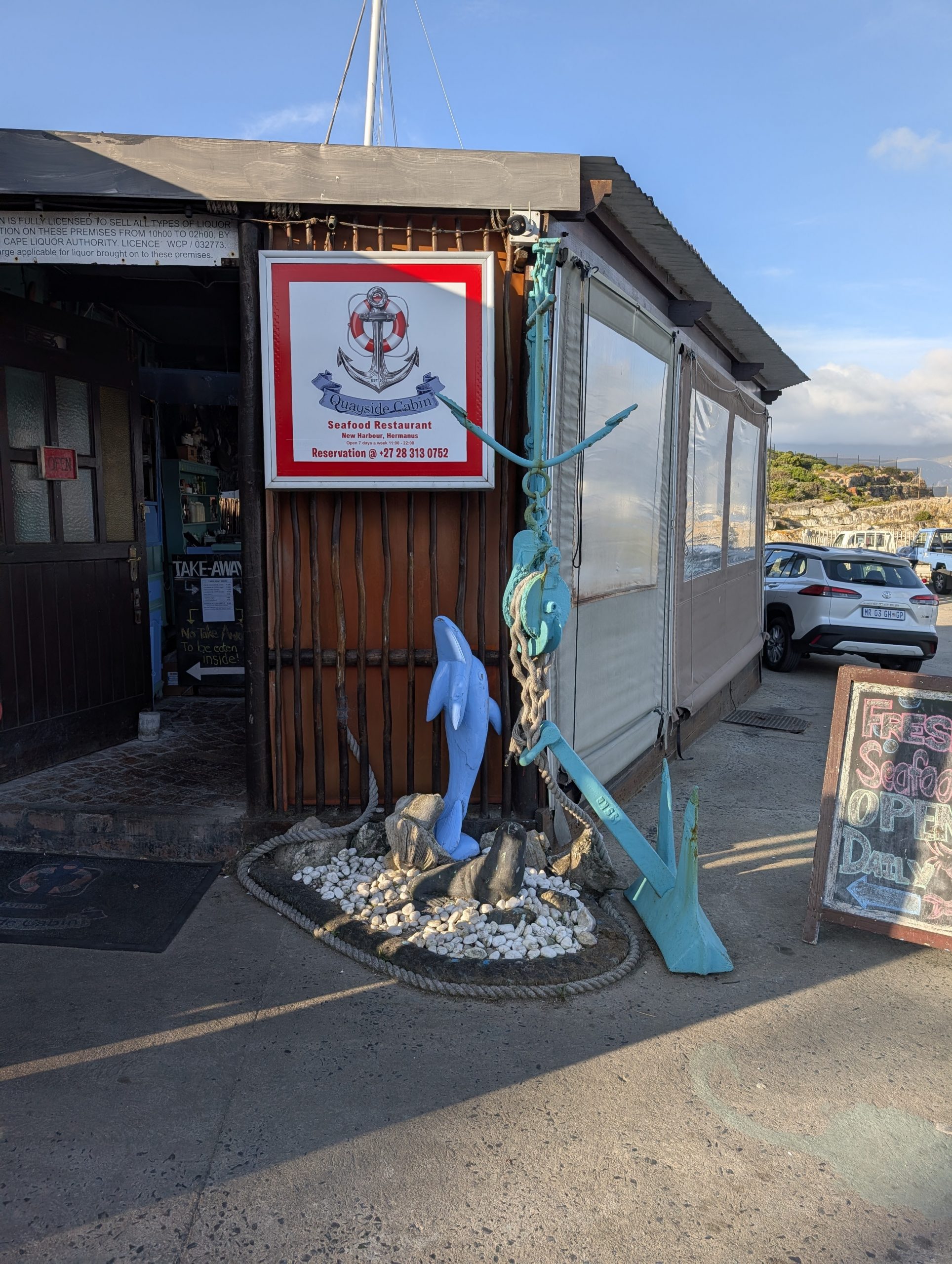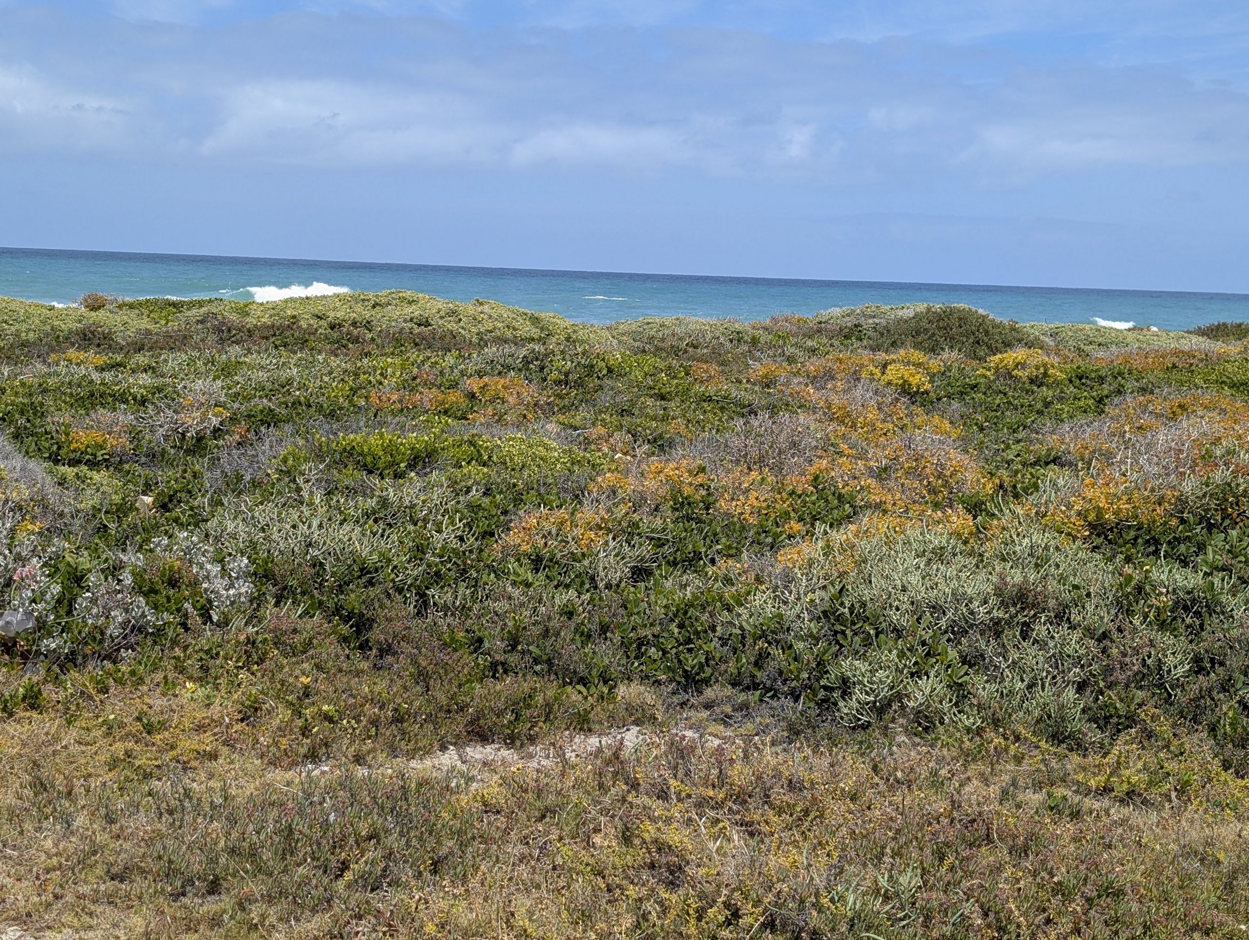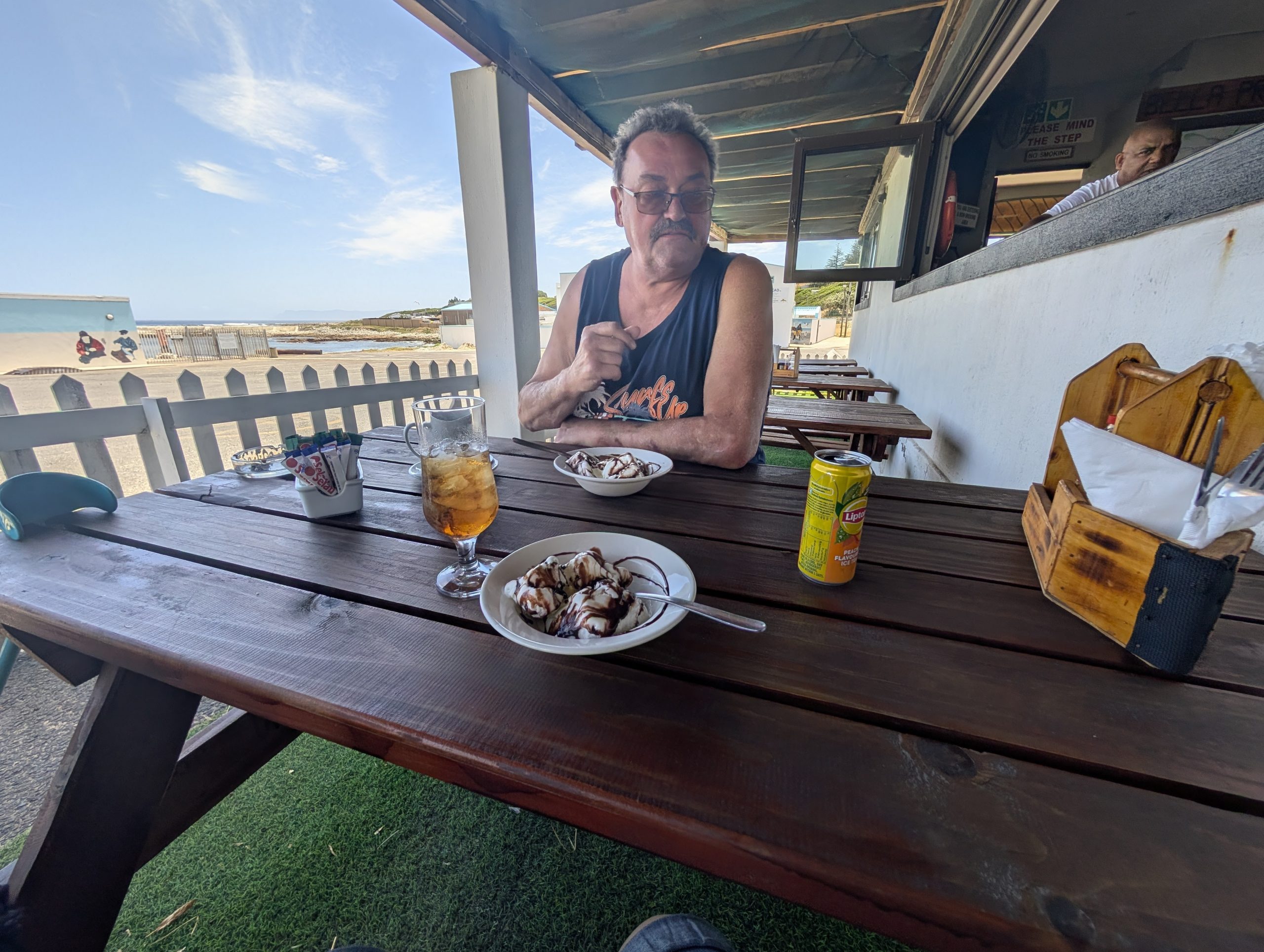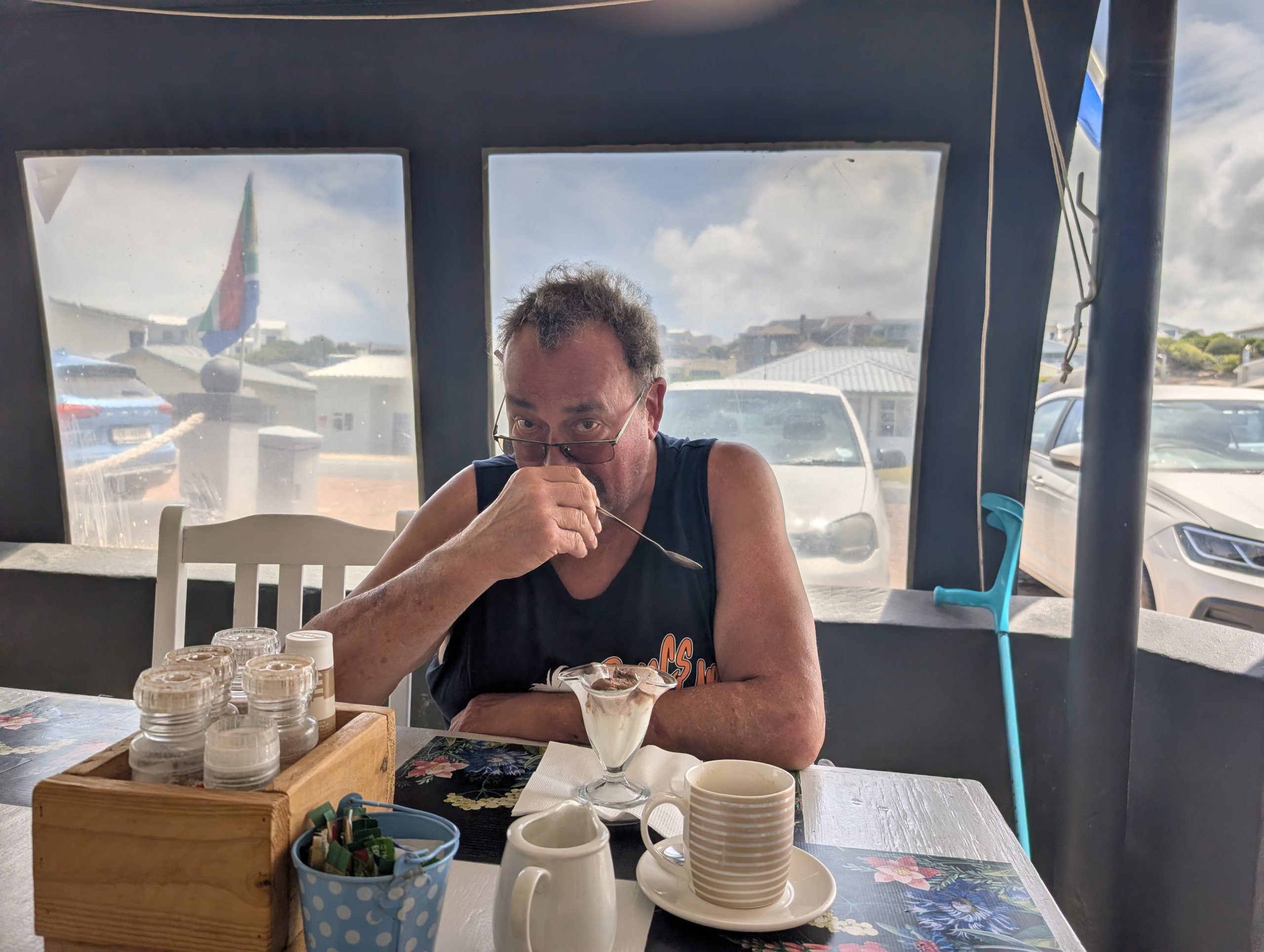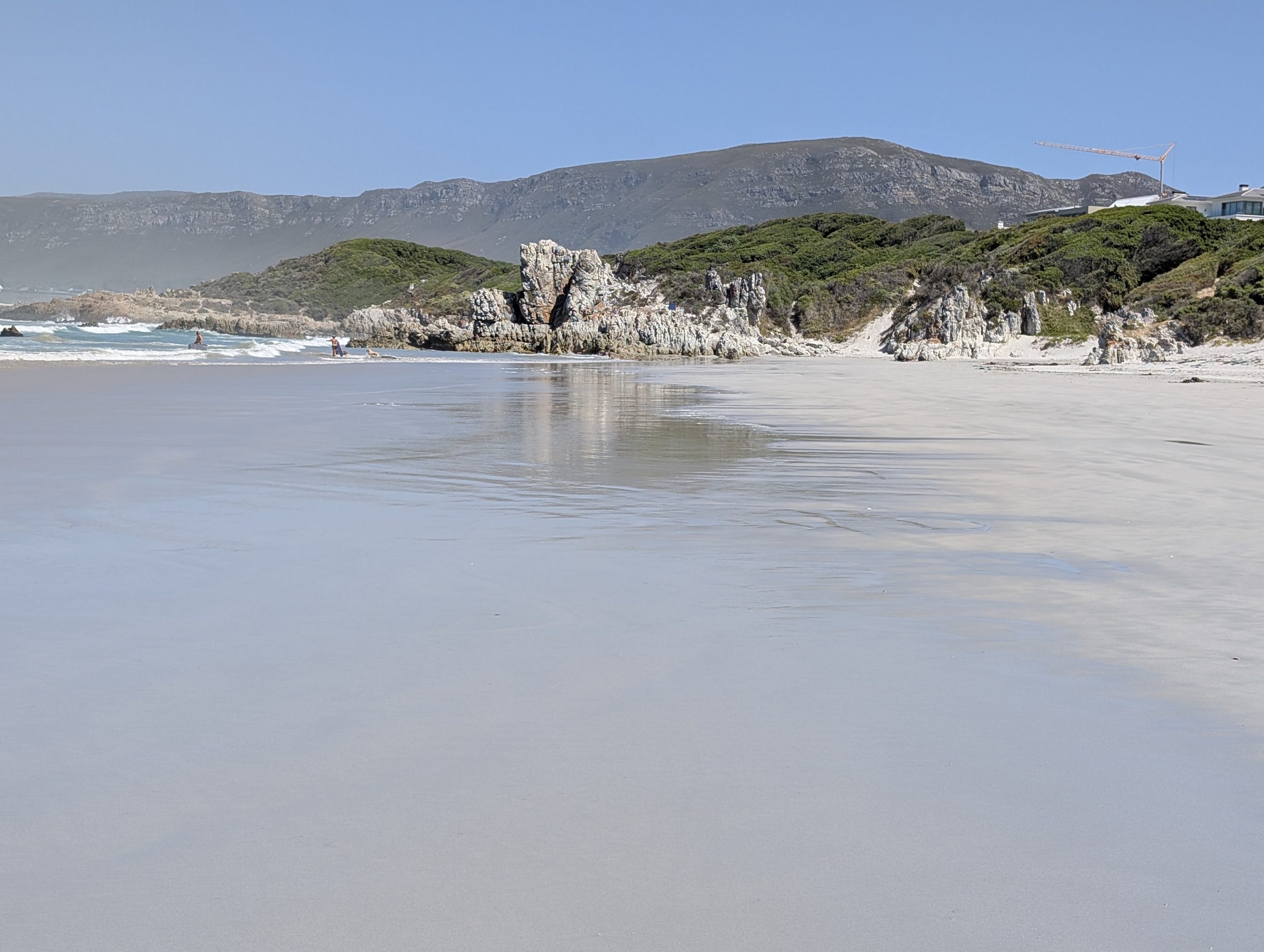 Nun müssen wir schon wieder weiter ziehen. Von unserer Gastwirtin erfuhren wir noch, dass wir unbedingt zum Cape Agulhas sollen, da es auf unserem Weg nach Wilderness liegt. Denn dort ist das Kap der guten Hoffnung, der southermost Point of Afrika. Viele denken nämlich, der ist an der Südspitze der Kaphalbinsel. Natürlich sind wir dahin, das stand eh auf meinem Wunschzettel. Ich dachte aber auch nicht, dass das so weit weg von der Kaphalbinsel ist. Ich habe noch schnell Melanie angeschrieben, ob wir das auf unserer Tour auf der Kaphalbinsel mit sehen, doch sie klärte mich auf, dass das viel zu weit weg ist. Wir fuhren also hin und es war ein toller Weg aus Brettern. Ich bin los gelaufen. Norbert meinte, dass er das nicht schaffen werde. Ich soll mir wieder Zeit lassen. Die Schmerzen von dem Sturz diese Woche waren schon gewaltig. Der Weg war ca. 3 km, für Gesunde gar kein Problem. Zwischendurch waren auch noch große Steine, ich bin wie auf rohen Eiern gelaufen. Ich hatte so eine Angst wieder zu fallen. Doch irgendwann habe ich den Punkt erreicht und es machte mich stolz. Es war eine Riesensteinplatte gewesen, die den Kontinent Afrika zeigte. In der Mitte an der Ostseite waren 2 Erhebungen, man erkannte den Kilimandscharo in Tansania und den Mt. kenia in Kenia genau auf dem Äquator. Weiter vorn waren 2 Schriftplatten, die rechte zeigte den Atlantik und die linke zeigte den indischen Ozean an. Das war nun das Kap der guten Hoffnung, eine sehr schwere Schiffspassage. Hier sind schon unzählige Schiffe gesunken, trotz des Leuchtturmes Agulhas, der älteste von Afrika. Nun wird es aber Zeit, den Rückzug anzutreten, wir haben heute noch eine weite Strecke zu fahren. Norbert hat mich sogar abgeholt, dort wo der Steinweg war. Ich war froh und dankbar, dass ich da nicht nochmal drüber musste. In dem Ort haben wir noch Kaffee getrunken und ein Eis gegessen. Nun wurde es aber Zeit. Das Navi sagte uns, noch 4,5 Stunden sind zu fahren. 17:30 erreichen wir den Ort Wilderness und unsere Lodge, das Dune Beach House. Wir haben mehrere Male geklingelt, keiner machte auf. Da sagte Norbert, ich soll Mal anrufen, Gott sei Dank habe ich ja eine afrikanische SIM Karte. Wir haben uns schnell eingerichtet. Wir haben die Gastwirtin gefragt, wo wir Abendessen gehen können, da hat hat sie uns sogar einen Fahrer mit angeboten. Das haben wir gerne angenommen. Die Gaststätte war toll. Norbert aß wieder Seafood, irgendwas mit Calamar und mir hat der Kellner Antilope empfohlen. Ich aß ein Steak mit Antilope und ein Steak mit Strauß, absolute Spitze. Als wir fertig waren, ließen wir den Fahrer wieder kommen und er fuhr uns wieder nach Hause. Wir waren ganz schön fertig und gingen beizeiten schlafen.