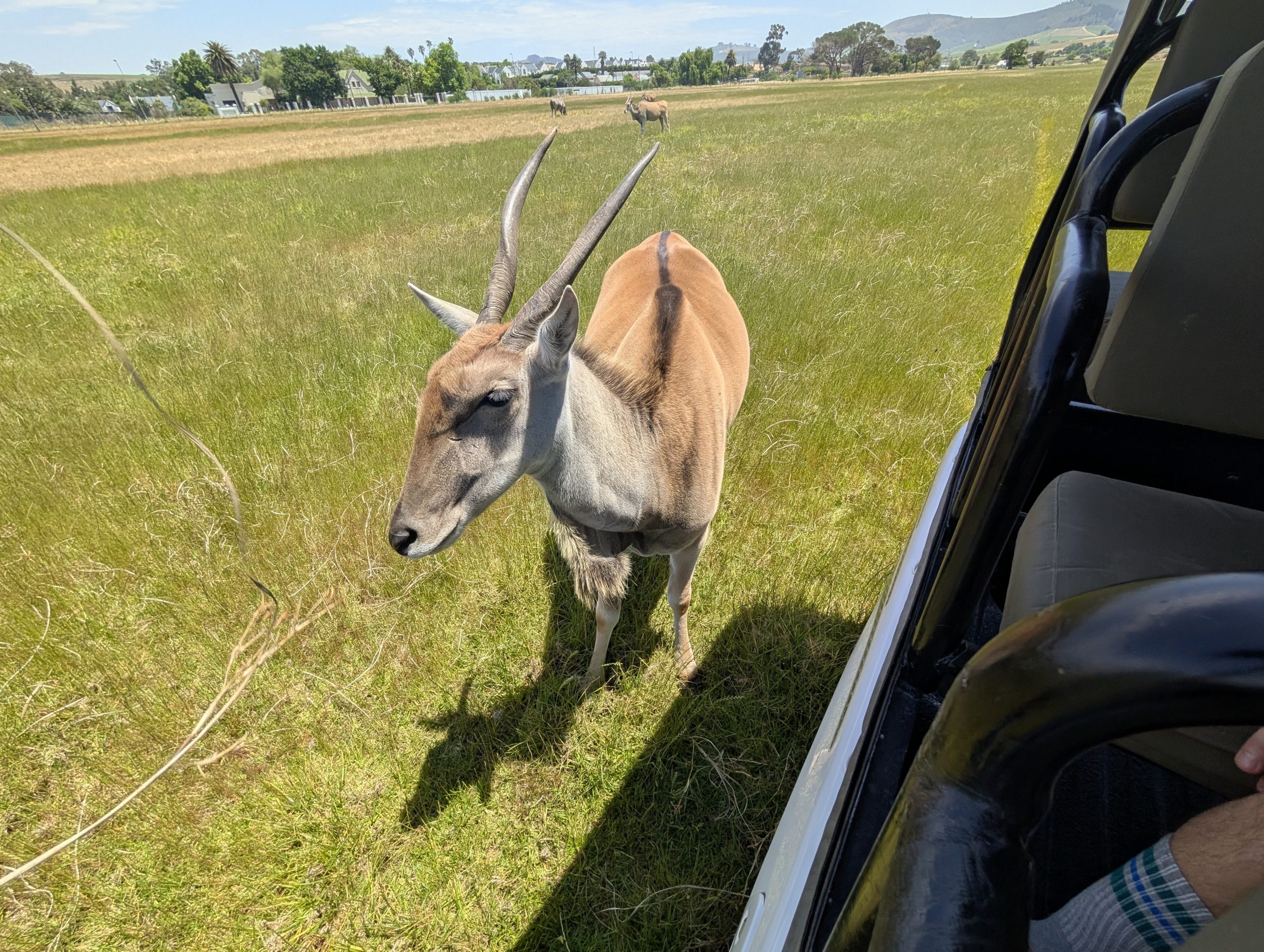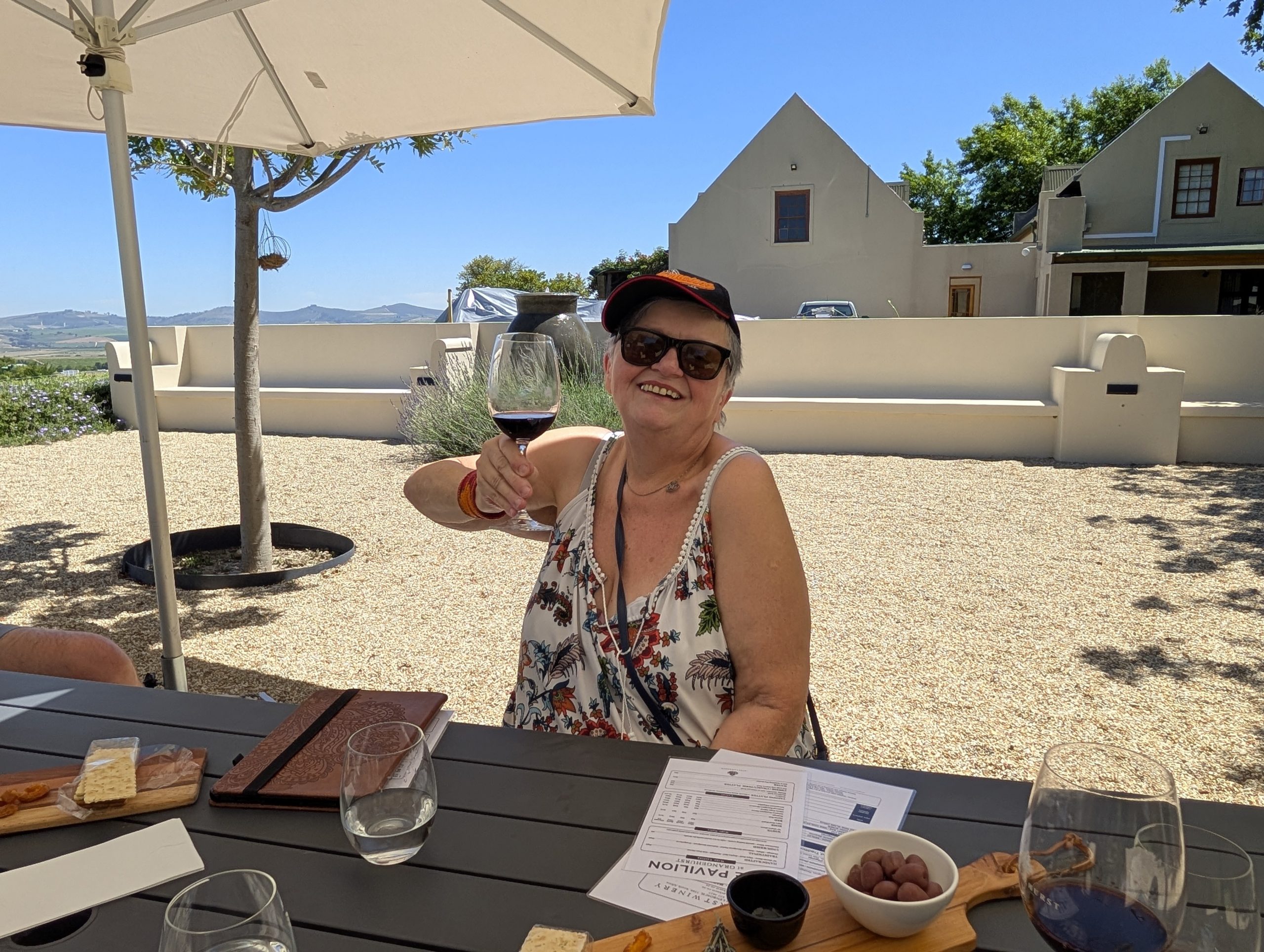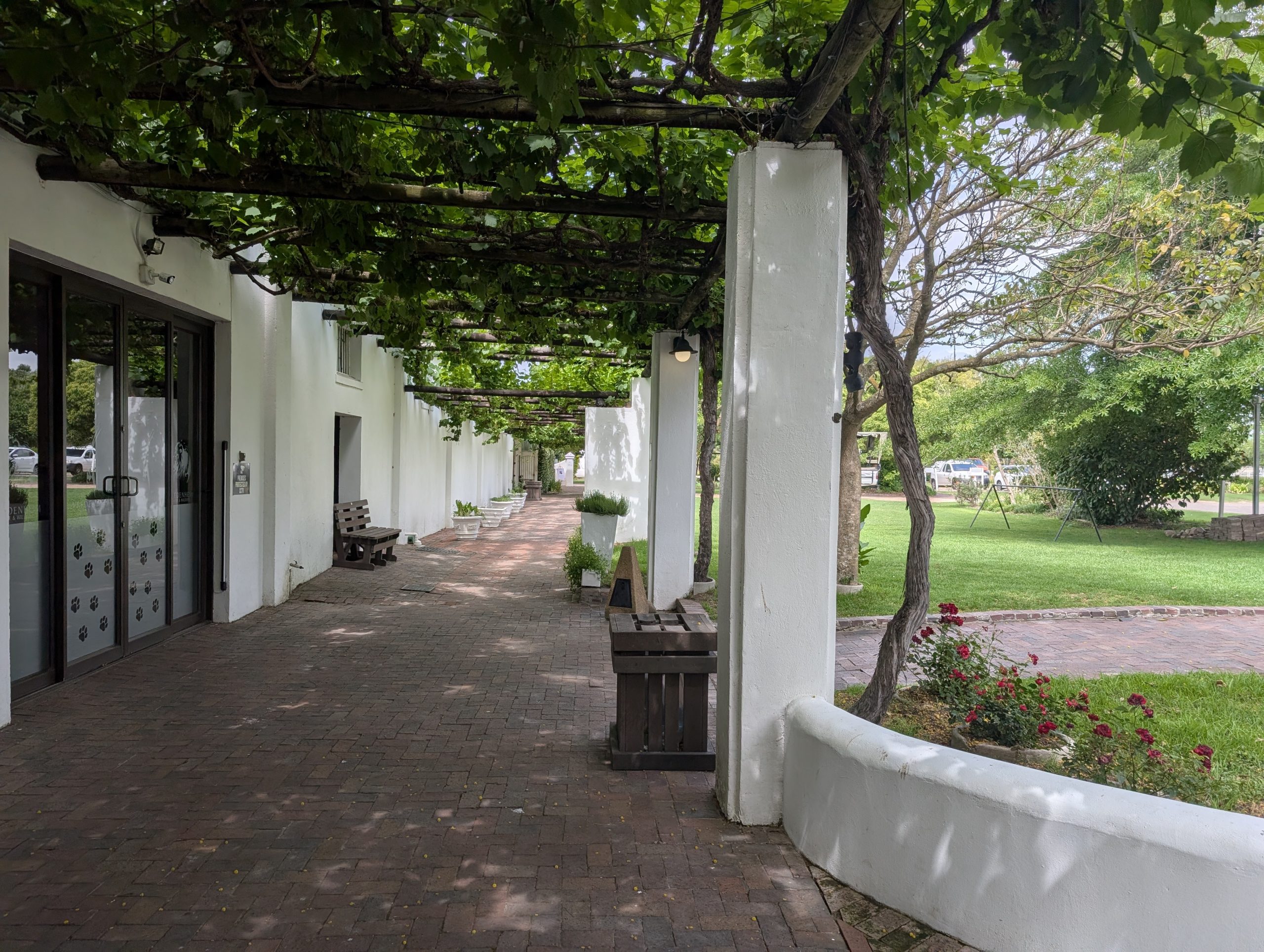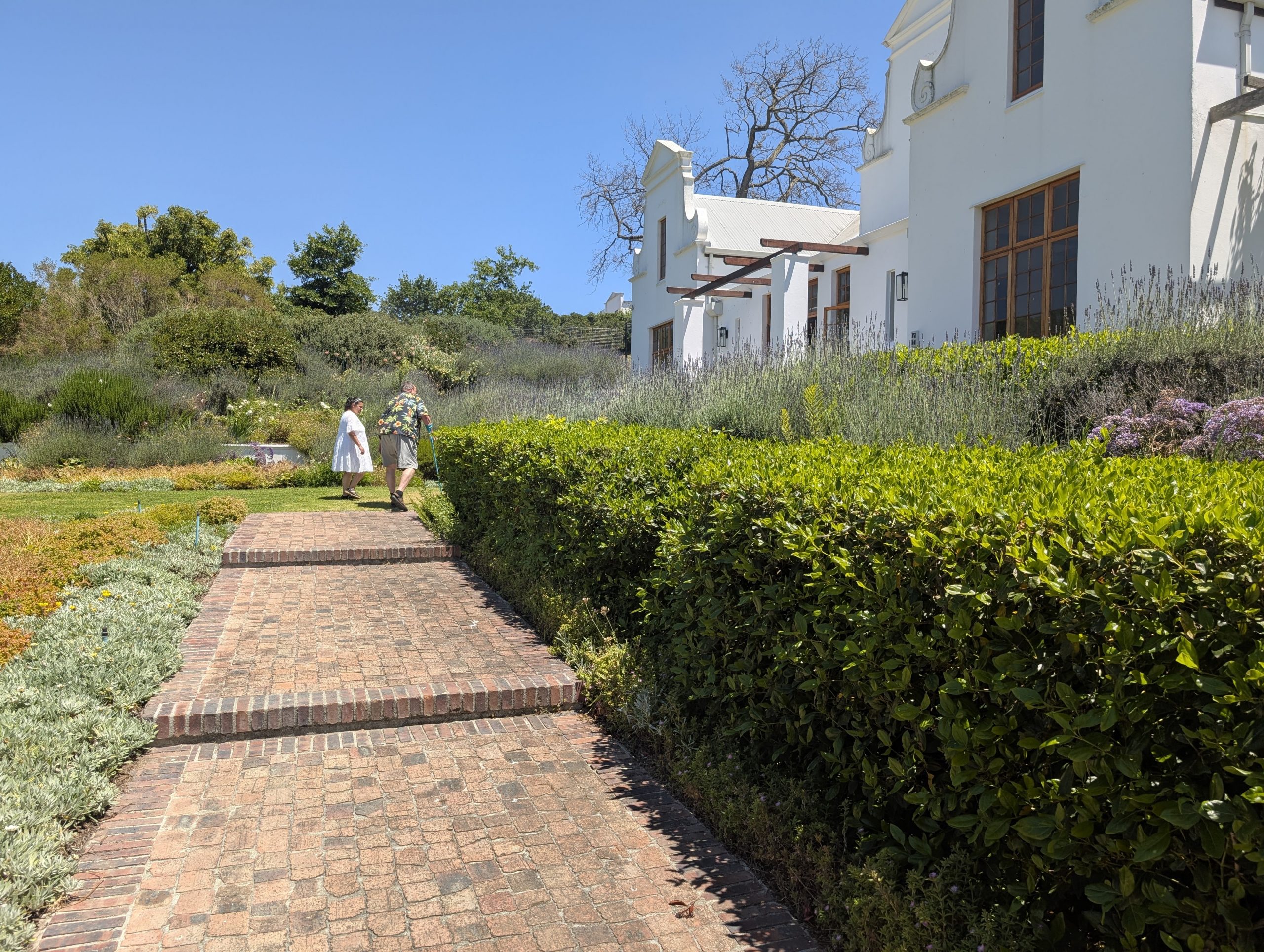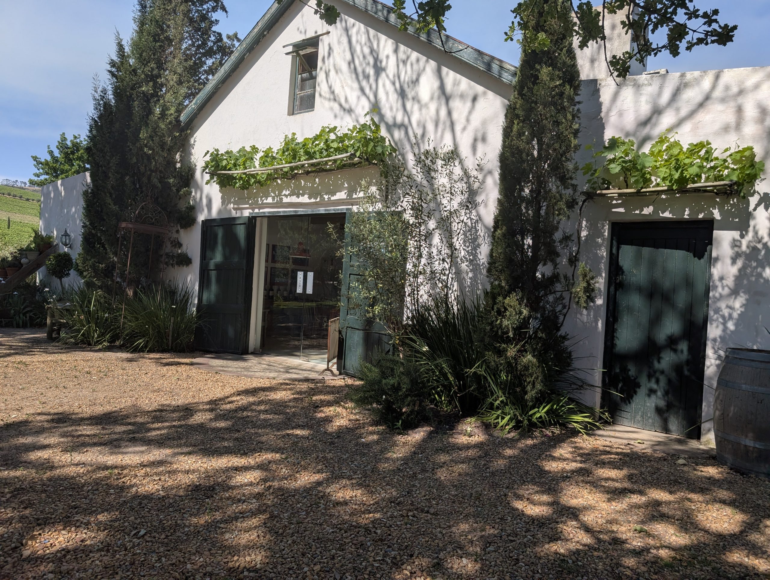 Melanie hat uns mitgeteilt, dass wir heute schon ¼ Stunde eher abgeholt werden. Leider haben wir es auch ein wenig verschlafen. Nun haben wir es eilig zum Frühstück zu kommen. Kaum haben wir uns gesetzt, kam einer auf mich zu. Ich fragte ihn, ob er unser Driver ist, er bejahte. Es war doch erst ¼ 10, also haben wir noch eine ½ Stunde. Das Frühstück war fantastisch. ¾10 kam ein weißer auf mich zu und fragte mich, ob ich Monika bin. Da habe ich ihn gefragt, ob er unser Driver ist und er hat ja gesagt. Wir fuhren zu einer anderen Lodge, die auch schon ein Weingut war. Dort stieg ein Ehepaar aus Hamburg ein, die auch mit Melanie unterwegs sind. Melanie hat im Vorfeld gefragt, ob wir was dagegen haben, wenn noch ein Paar mitfährt. Wir waren damit einverstanden und bekamen 40€ wieder zurück. Wir fuhren erstmal zum Weingut Grangehurst. Es war ein fantastisches Weingut. Wir bekamen 4 Weine zum probieren. Die Frau erklärte uns, dass in unmittelbarer Nähe in erster Linie der Pinotage angebaut wird, da er eine ganz besondere Note hat. Ich war eigentlich schon nach dem ersten Glas hin. Der letzte war 17 Jahre alt aus dem Jahr 2008. Dann ging es zum nächsten Gut, das, Reyneke. Es befindet sich gerade viel im Umbau, doch das Herrenhaus konnte Gäste zur Weinprobe empfangen. Hier baut man sehr auf Nachhaltigkeit und baut alles mit Hilfe von Tieren biologisch an. Von ihr haben wir erfahren, dass das Holz für die Weinfässer unbedingt französische Eiche sein muss. Die südafrikanische Eiche eignet sich dafür, weil sie zu schnell wächst. Auch hat die Kork Industrie Probleme, deswegen steigt man auf Glasverschlüsse um.