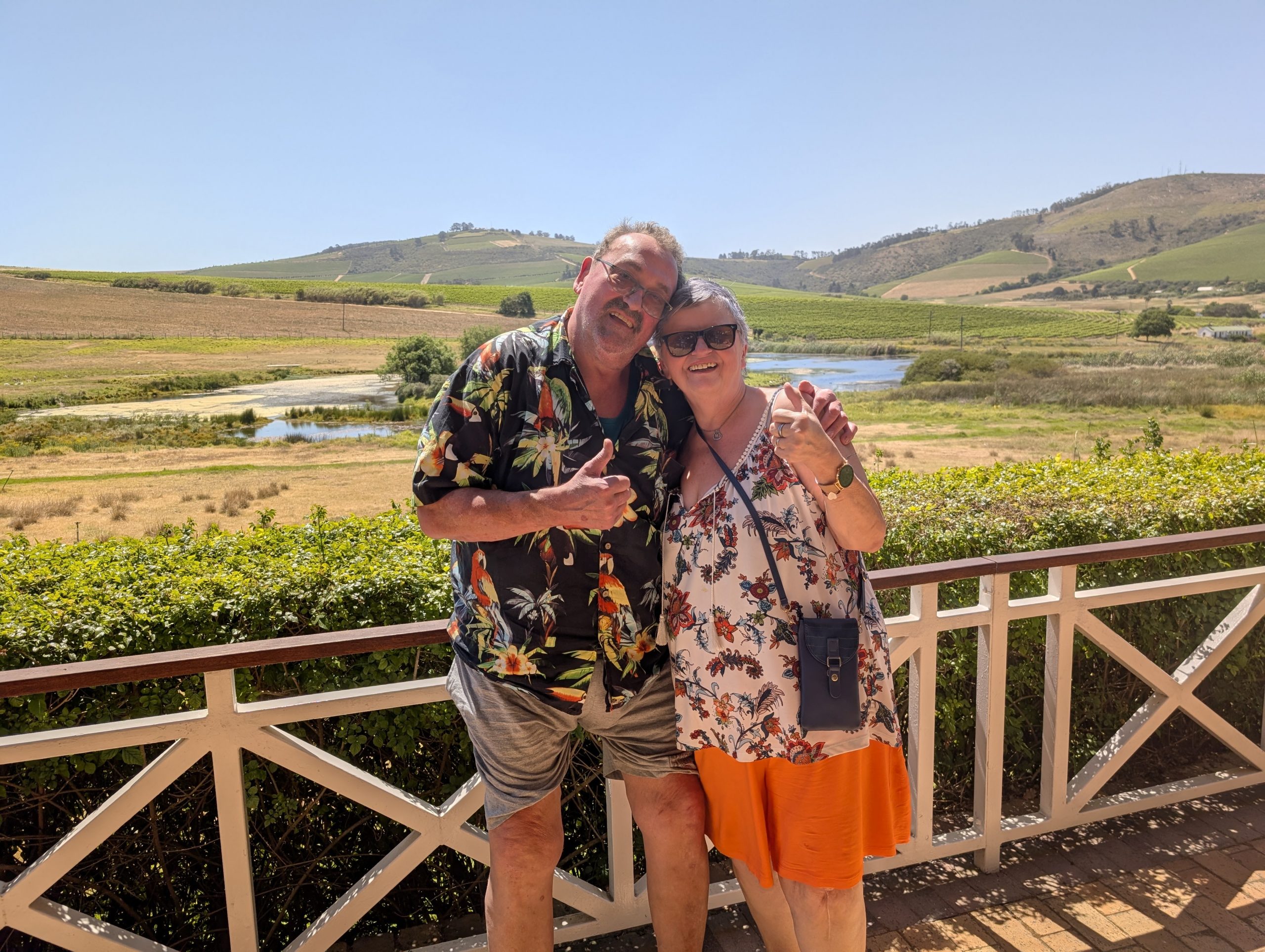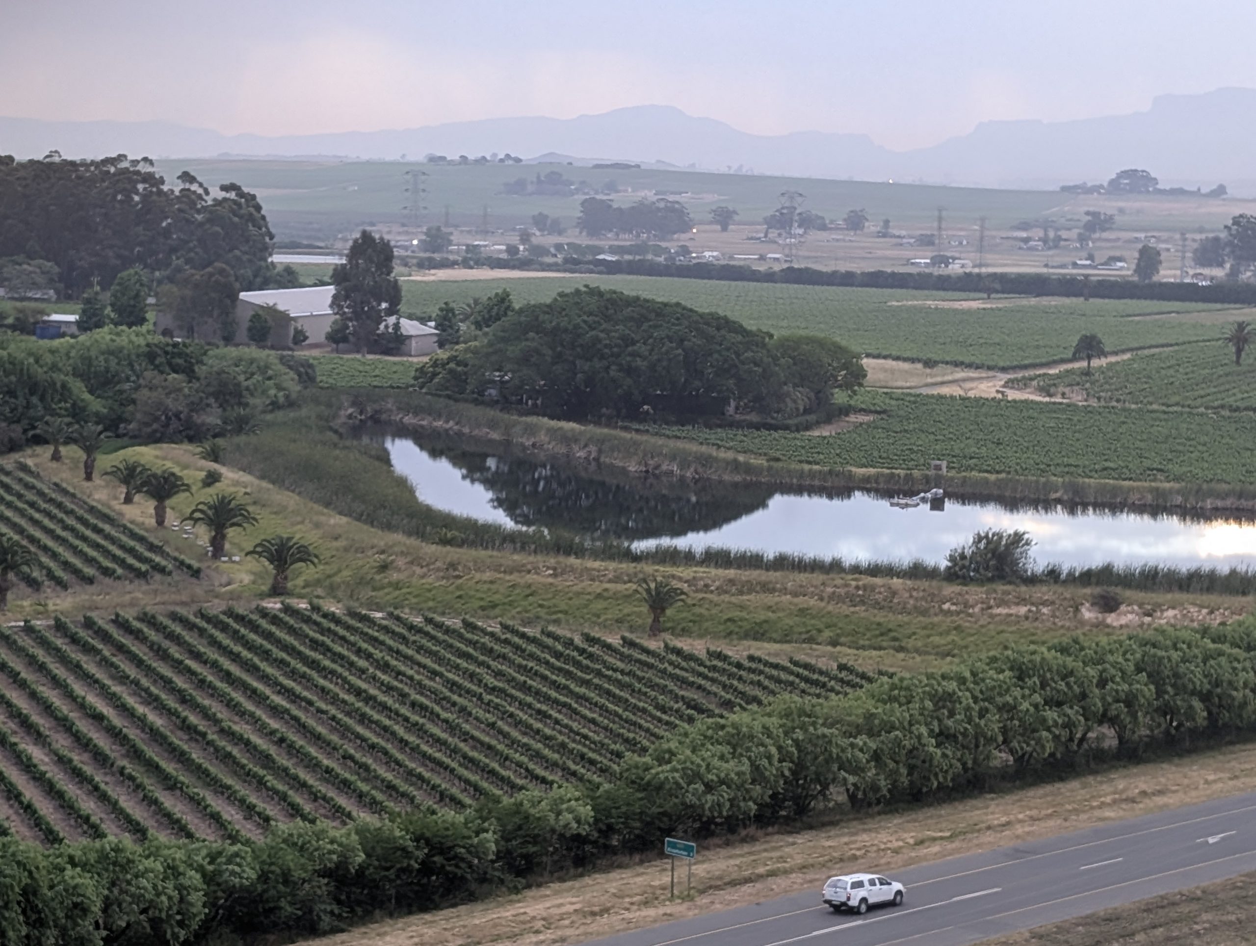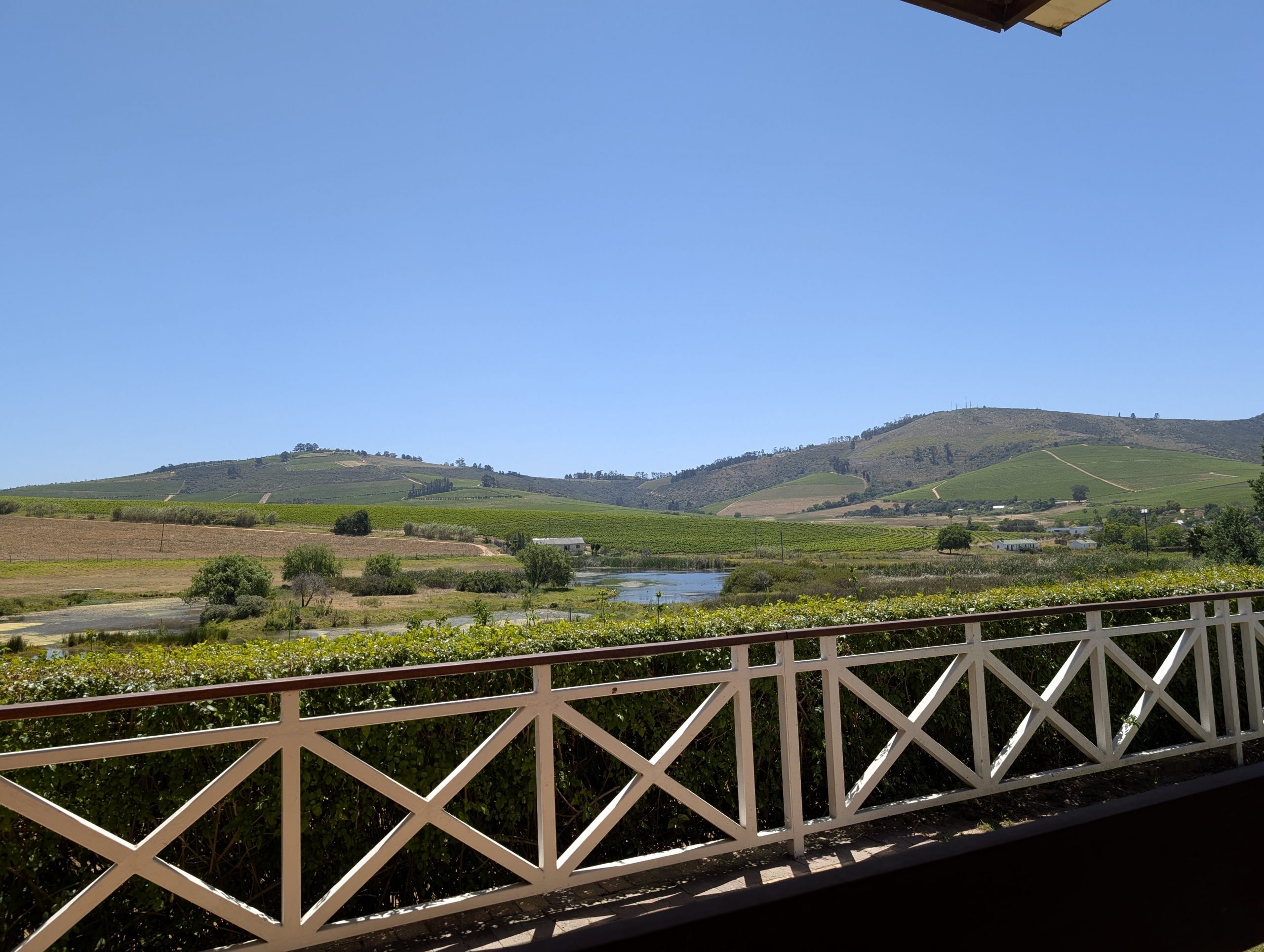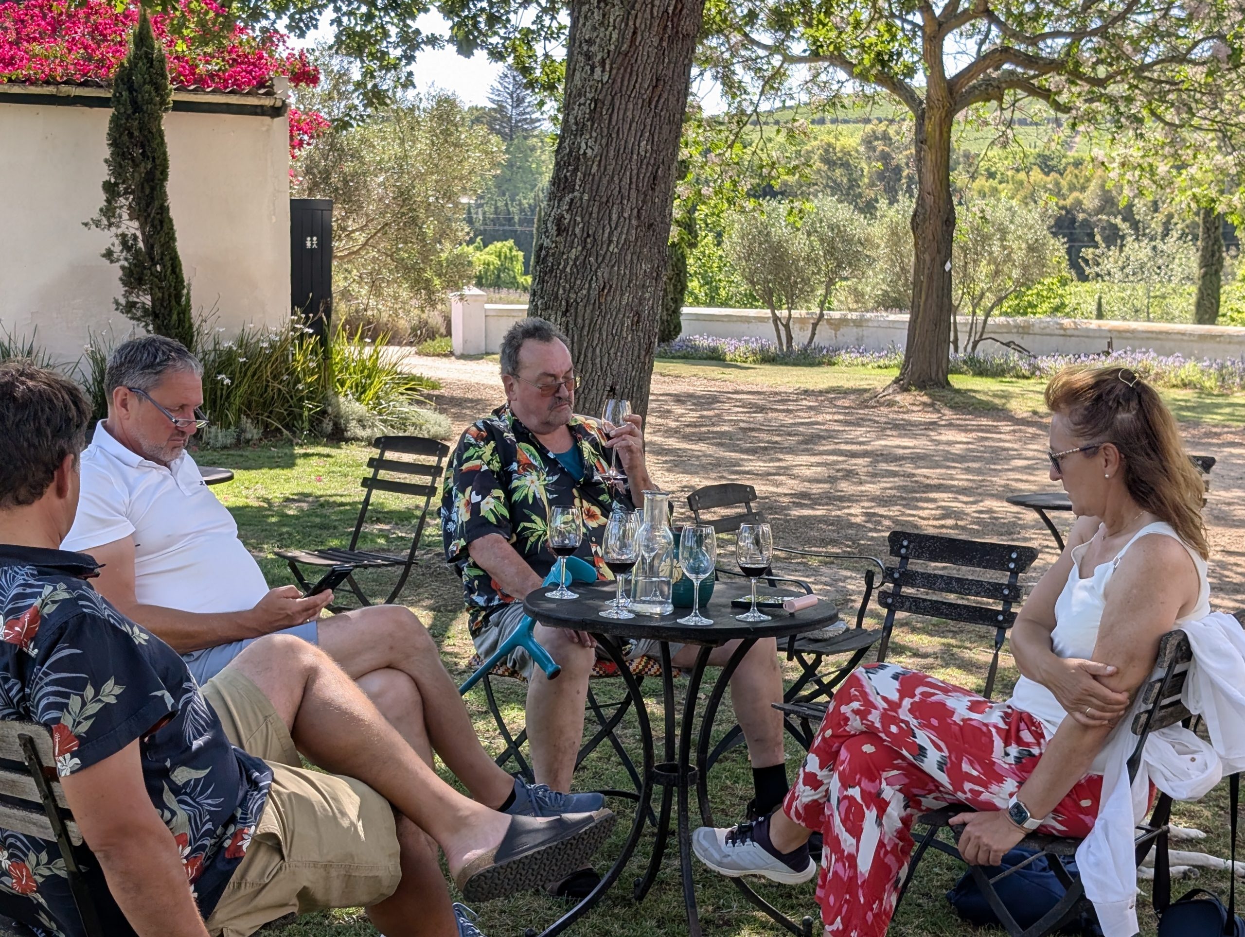 Melanie hat uns mitgeteilt, dass wir heute schon ¼ Stunde eher abgeholt werden. Leider haben wir es auch ein wenig verschlafen. Nun haben wir es eilig zum Frühstück zu kommen. Kaum haben wir uns gesetzt, kam einer auf mich zu. Ich fragte ihn, ob er unser Driver ist, er bejahte. Es war doch erst ¼ 10, also haben wir noch eine ½ Stunde. Das Frühstück war fantastisch. ¾10 kam ein weißer auf mich zu und fragte mich, ob ich Monika bin. Da habe ich ihn gefragt, ob er unser Driver ist und er hat ja gesagt. Wir fuhren zu einer anderen Lodge, die auch schon ein Weingut war. Dort stieg ein Ehepaar aus Hamburg ein, die auch mit Melanie unterwegs sind. Melanie hat im Vorfeld gefragt, ob wir was dagegen haben, wenn noch ein Paar mitfährt. Wir waren damit einverstanden und bekamen 40€ wieder zurück. Wir fuhren erstmal zum Weingut Grangehurst. Es war ein fantastisches Weingut. Wir bekamen 4 Weine zum probieren. Die Frau erklärte uns, dass in unmittelbarer Nähe in erster Linie der Pinotage angebaut wird, da er eine ganz besondere Note hat. Ich war eigentlich schon nach dem ersten Glas hin. Der letzte war 17 Jahre alt aus dem Jahr 2008. Dann ging es zum nächsten Gut, das, Reyneke. Es befindet sich gerade viel im Umbau, doch das Herrenhaus konnte Gäste zur Weinprobe empfangen. Hier baut man sehr auf Nachhaltigkeit und baut alles mit Hilfe von Tieren biologisch an. Von ihr haben wir erfahren, dass das Holz für die Weinfässer unbedingt französische Eiche sein muss. Die südafrikanische Eiche eignet sich dafür, weil sie zu schnell wächst. Auch hat die Kork Industrie Probleme, deswegen steigt man auf Glasverschlüsse um.
