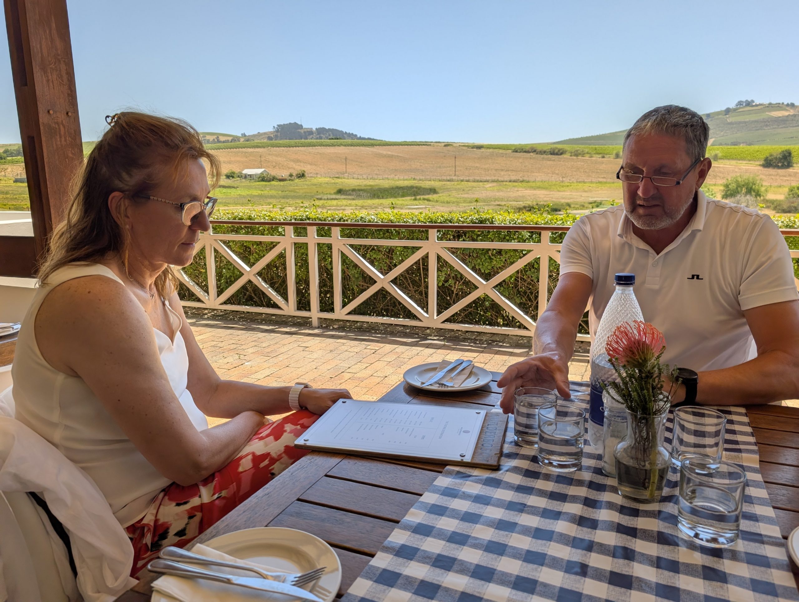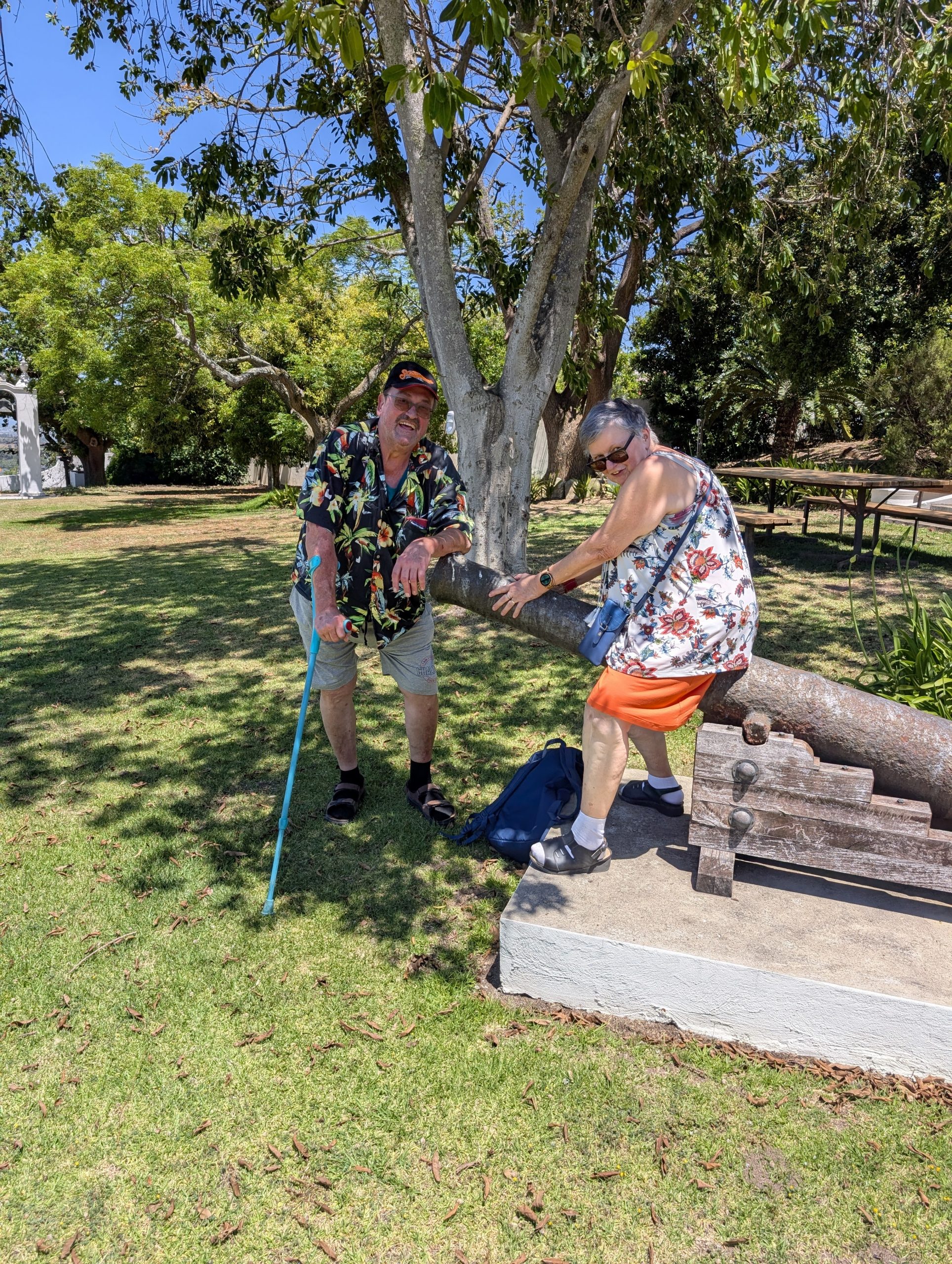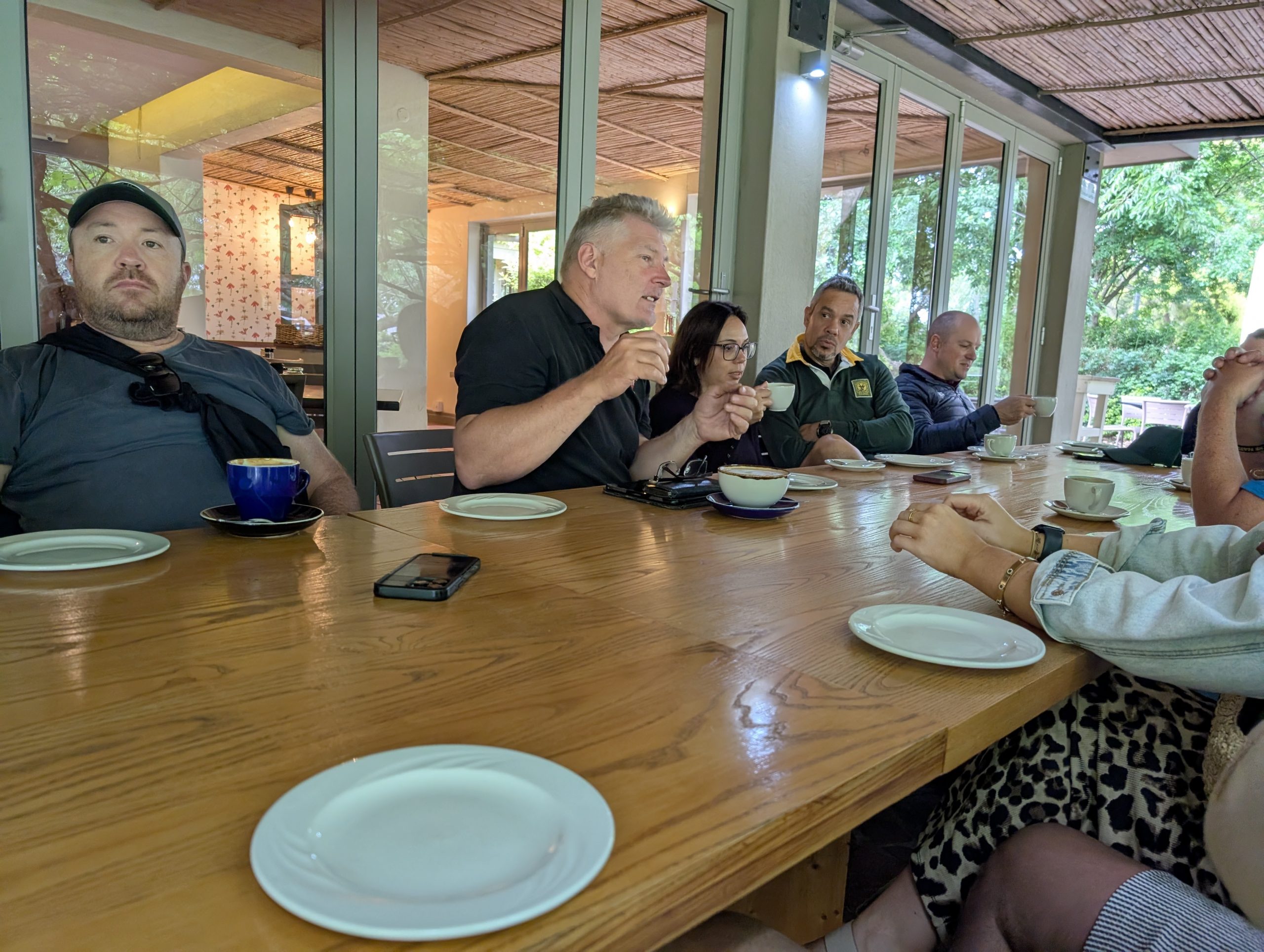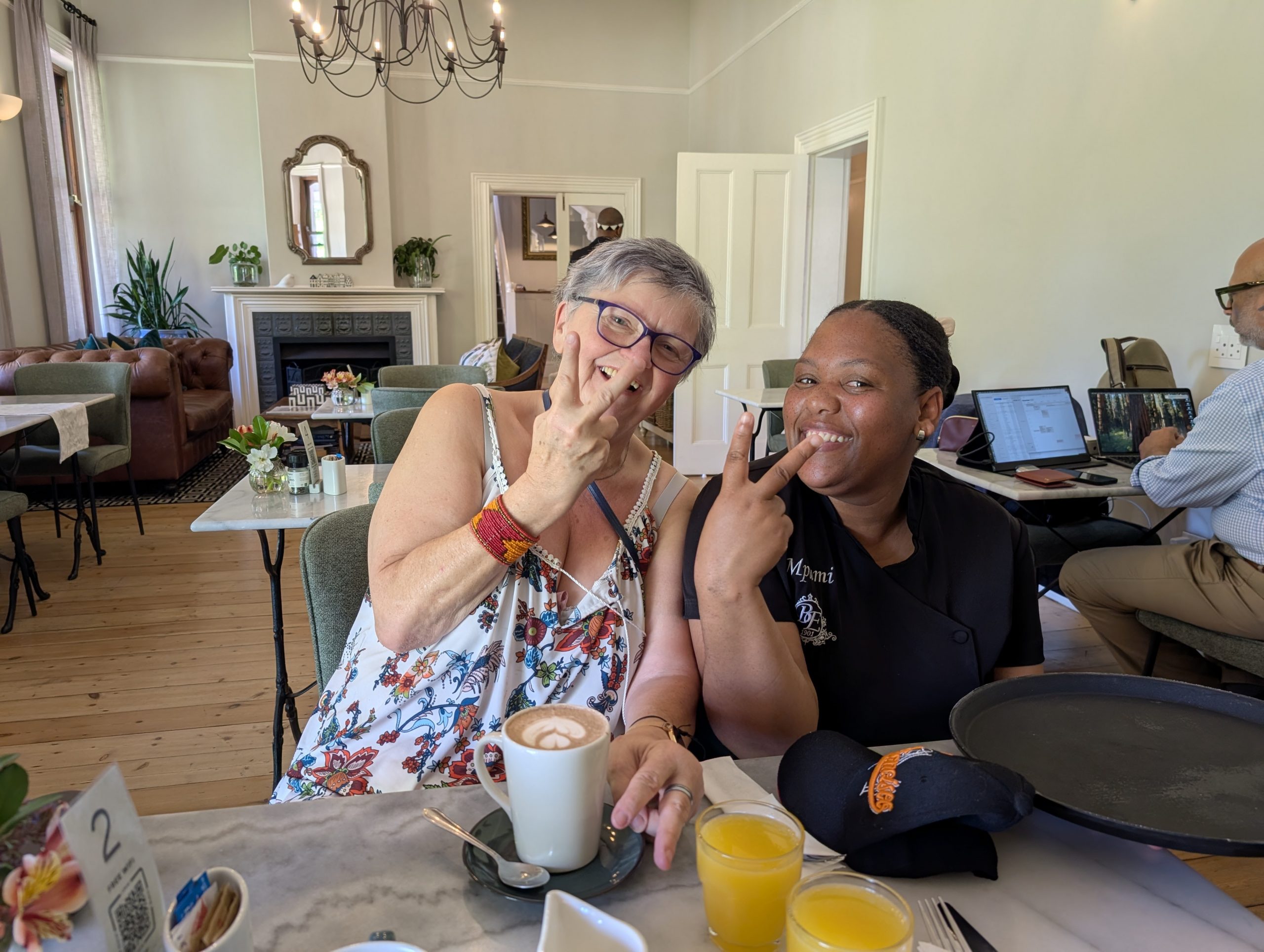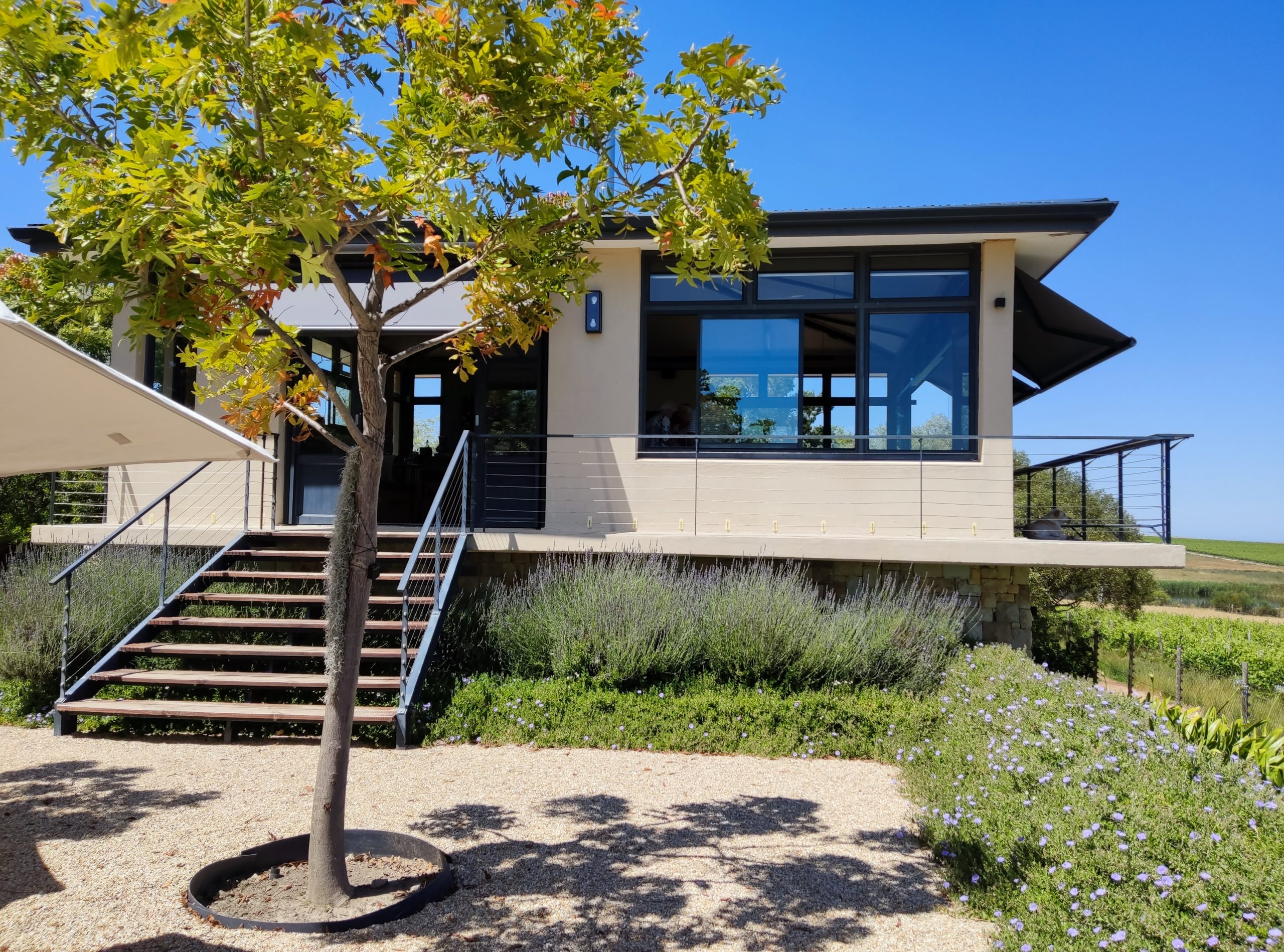 Melanie hat uns mitgeteilt, dass wir heute schon ¼ Stunde eher abgeholt werden. Leider haben wir es auch ein wenig verschlafen. Nun haben wir es eilig zum Frühstück zu kommen. Kaum haben wir uns gesetzt, kam einer auf mich zu. Ich fragte ihn, ob er unser Driver ist, er bejahte. Es war doch erst ¼ 10, also haben wir noch eine ½ Stunde. Das Frühstück war fantastisch. ¾10 kam ein weißer auf mich zu und fragte mich, ob ich Monika bin. Da habe ich ihn gefragt, ob er unser Driver ist und er hat ja gesagt. Wir fuhren zu einer anderen Lodge, die auch schon ein Weingut war. Dort stieg ein Ehepaar aus Hamburg ein, die auch mit Melanie unterwegs sind. Melanie hat im Vorfeld gefragt, ob wir was dagegen haben, wenn noch ein Paar mitfährt. Wir waren damit einverstanden und bekamen 40€ wieder zurück. Wir fuhren erstmal zum Weingut Grangehurst. Es war ein fantastisches Weingut. Wir bekamen 4 Weine zum probieren. Die Frau erklärte uns, dass in unmittelbarer Nähe in erster Linie der Pinotage angebaut wird, da er eine ganz besondere Note hat. Ich war eigentlich schon nach dem ersten Glas hin. Der letzte war 17 Jahre alt aus dem Jahr 2008. Dann ging es zum nächsten Gut, das, Reyneke. Es befindet sich gerade viel im Umbau, doch das Herrenhaus konnte Gäste zur Weinprobe empfangen. Hier baut man sehr auf Nachhaltigkeit und baut alles mit Hilfe von Tieren biologisch an. Von ihr haben wir erfahren, dass das Holz für die Weinfässer unbedingt französische Eiche sein muss. Die südafrikanische Eiche eignet sich dafür, weil sie zu schnell wächst. Auch hat die Kork Industrie Probleme, deswegen steigt man auf Glasverschlüsse um.