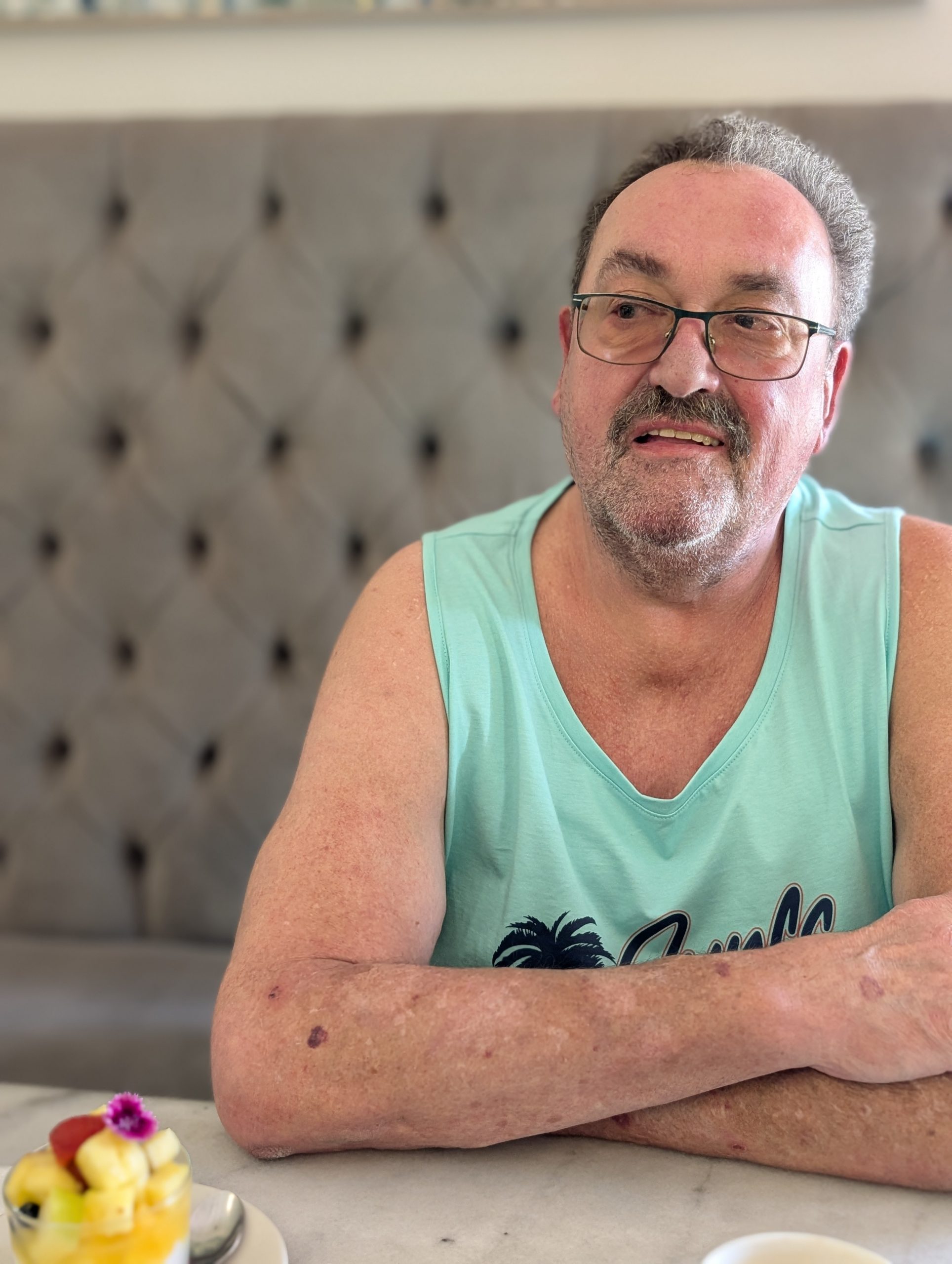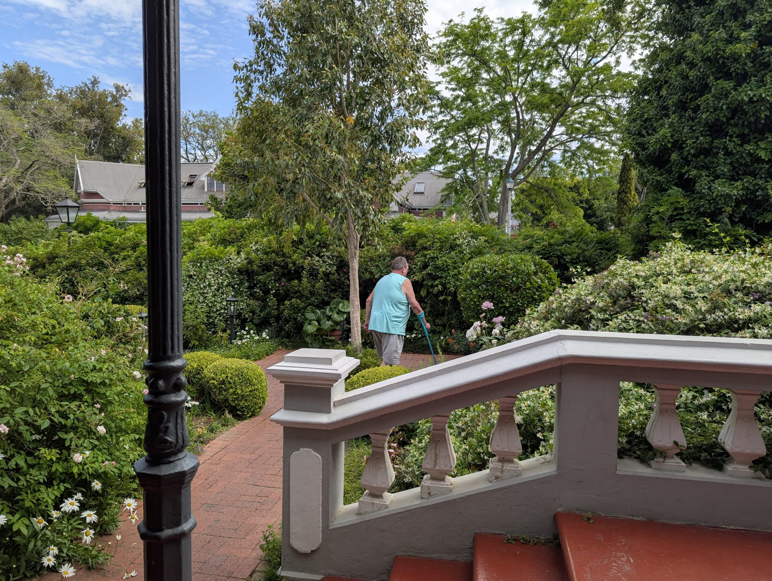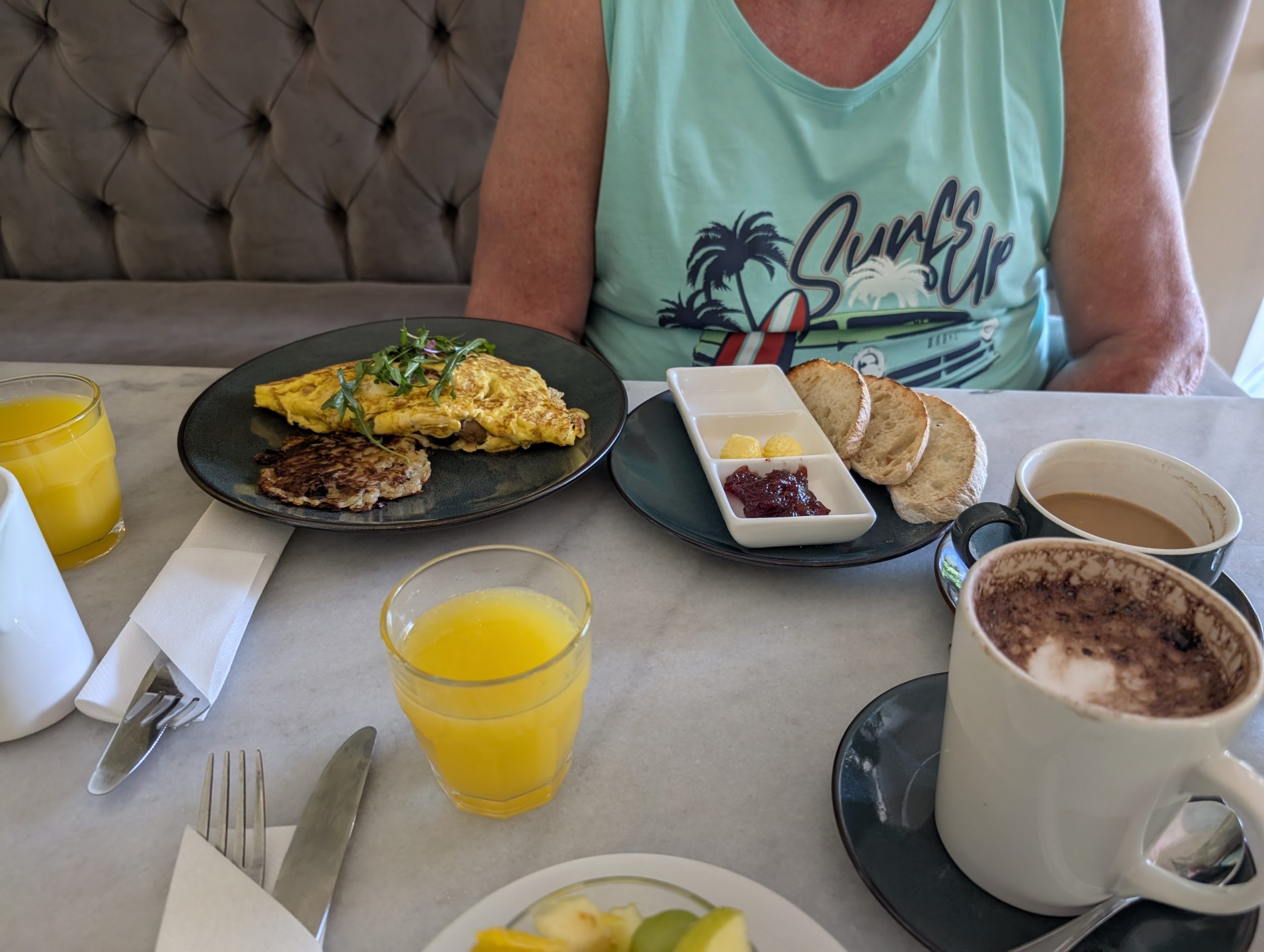 Am Nachmittag sind wir nach Kapstadt nach Muizenberg. Dort sind die alten bunten Badehäuser. Auf dem Weg dorthin haben wir schon Mal den berühmten Tafelberg gesehen, der allerdings sehr im Dunst war. In Muizenberg waren alle Parkplätze belegt. Eine Aufsicht gab uns trotzdem noch einen kleinen Platz, er war sehr nett. Auf den Weg zu den Badehäusern war ein Riesenschwimmbad, wo vor allem die Kinder Spaß hatten. Man brauchte nicht mal Eintritt bezahlen. Ich ging dann alleine zum Strand mit diesen Badehäusern. Die waren so schön. Das Meer hatte schöne Wellen, wo vor allem Surfer auf die Kosten kamen. Dann sind eine Meute Kinder angerannt kommen und rein in die Wellen gestürzt.Dann sind wir noch an die Promenade. Dort haben wir beide jeder ein Soft Eis gegessen und in der ältesten Surfschule ein Kaffee getrunken. Es war ein sehr schöner Tag. Nun ging es zurück nach Stellenbosch. Dort haben wir in einem beliebten Steakhouse zu Abend gegessen.